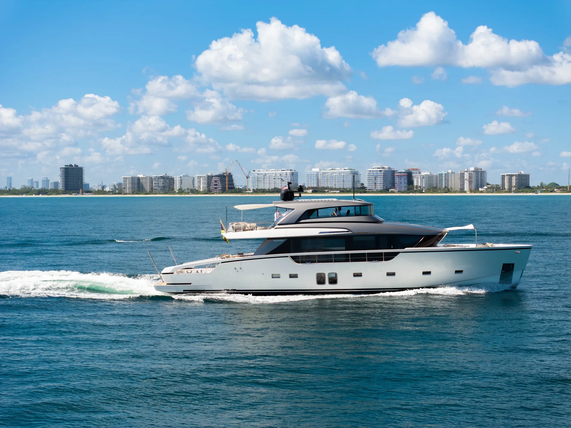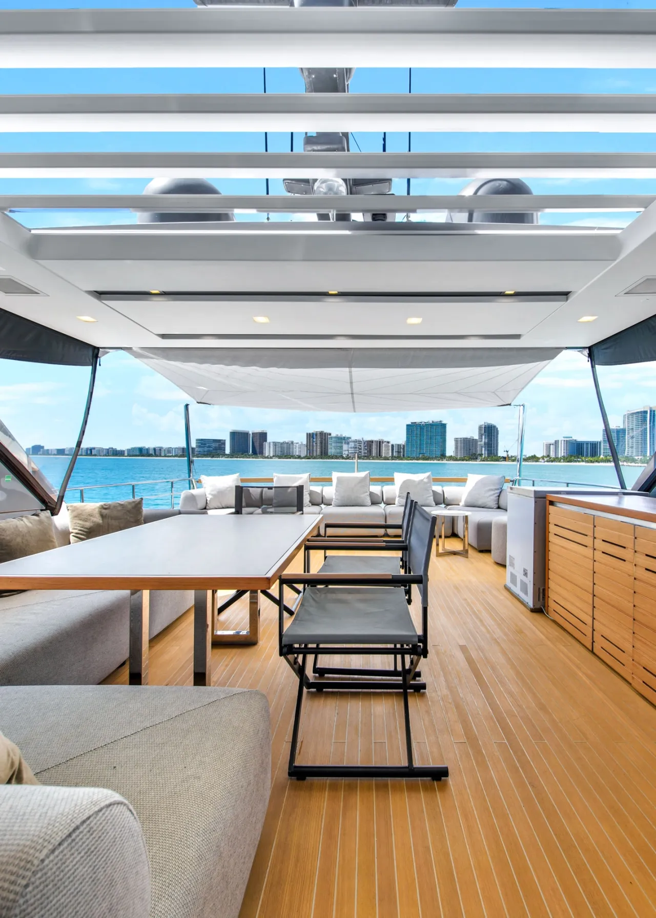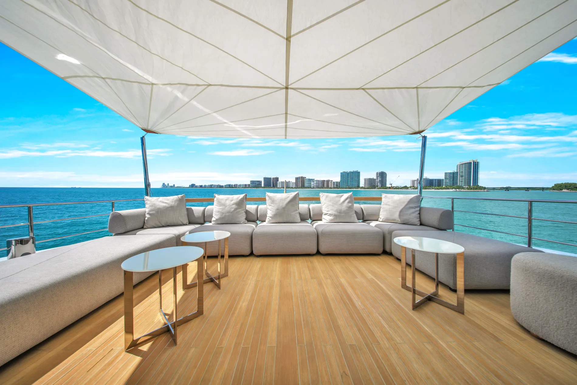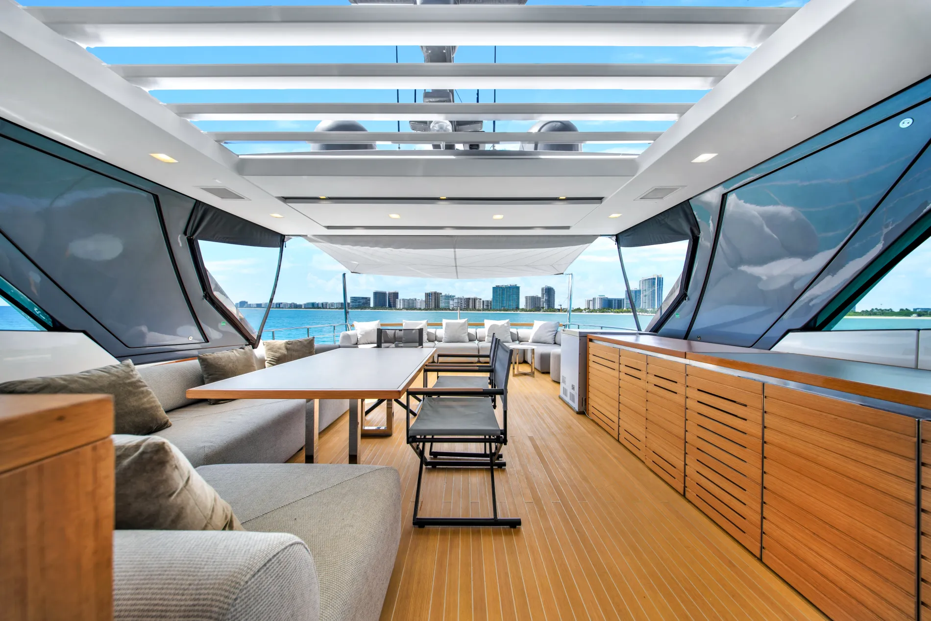 The SX88 offers a spacious aft deck that converts into a beach club, along with a flybridge and bow lounge designed for outdoor enjoyment.