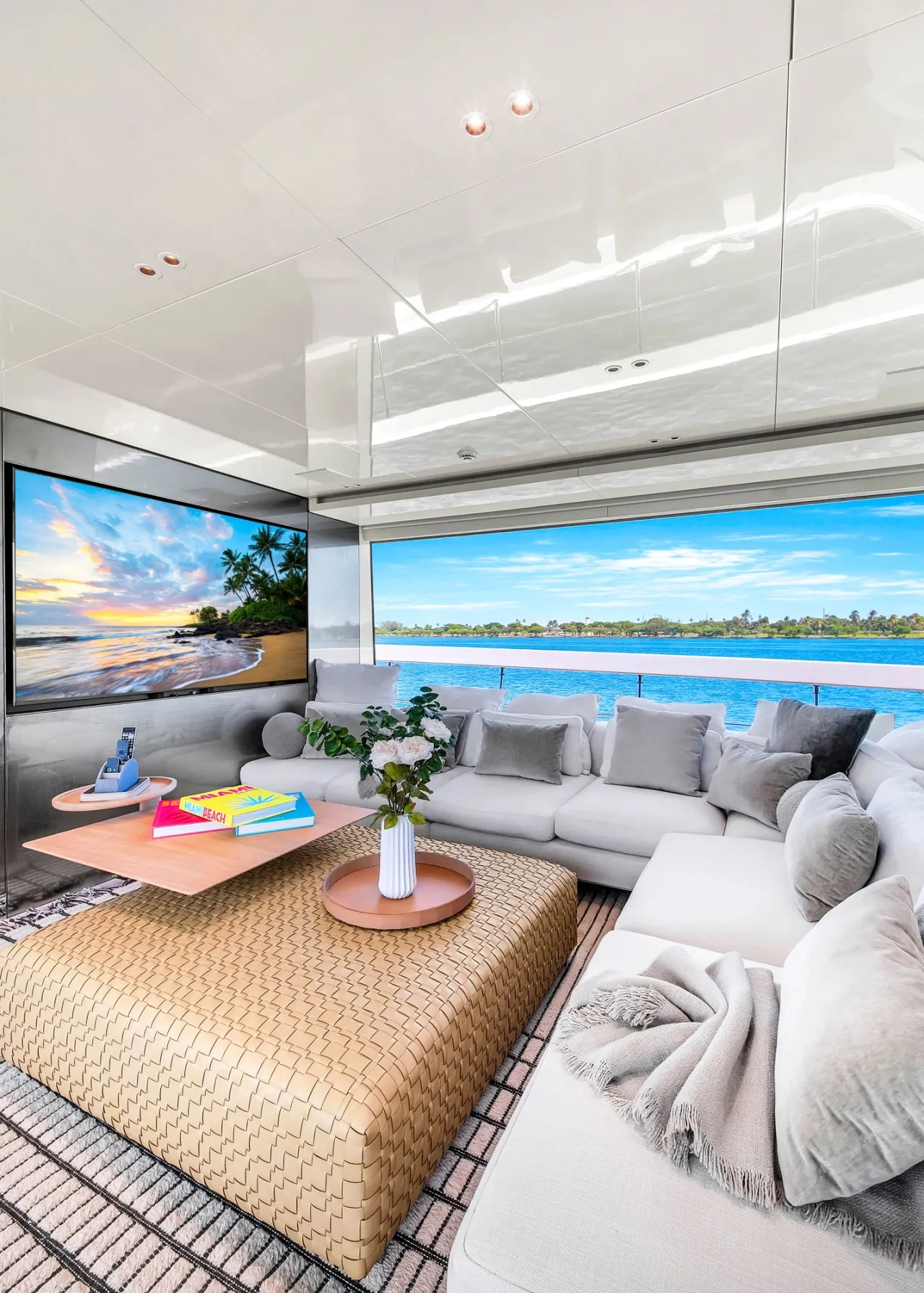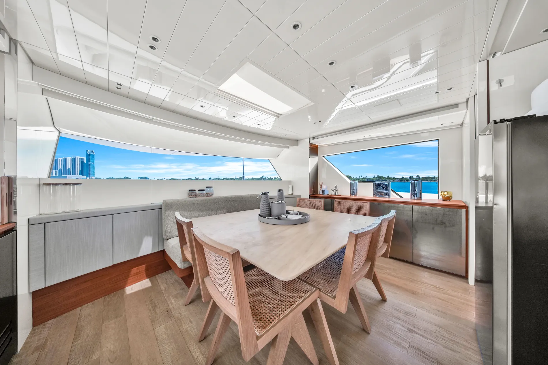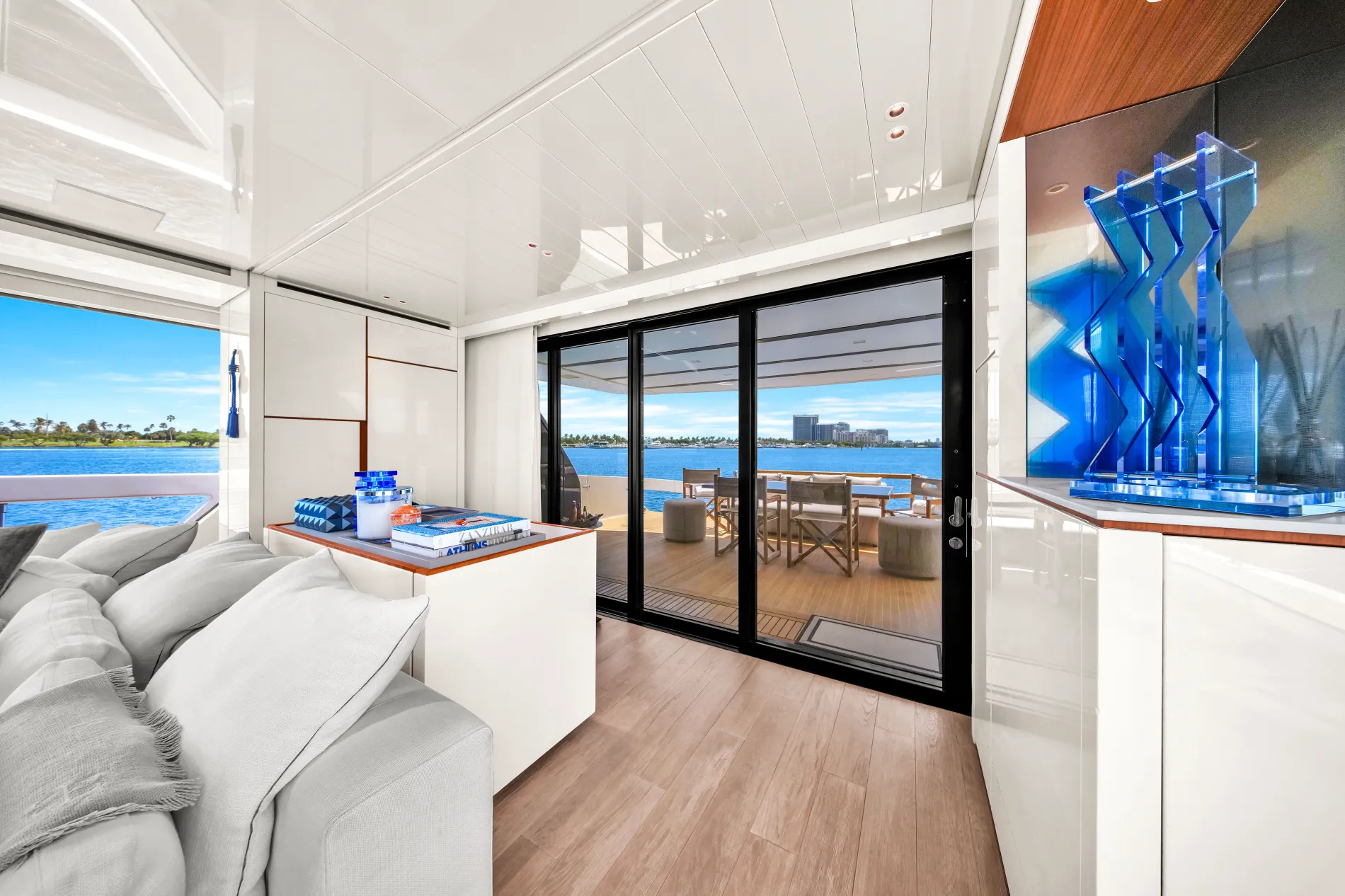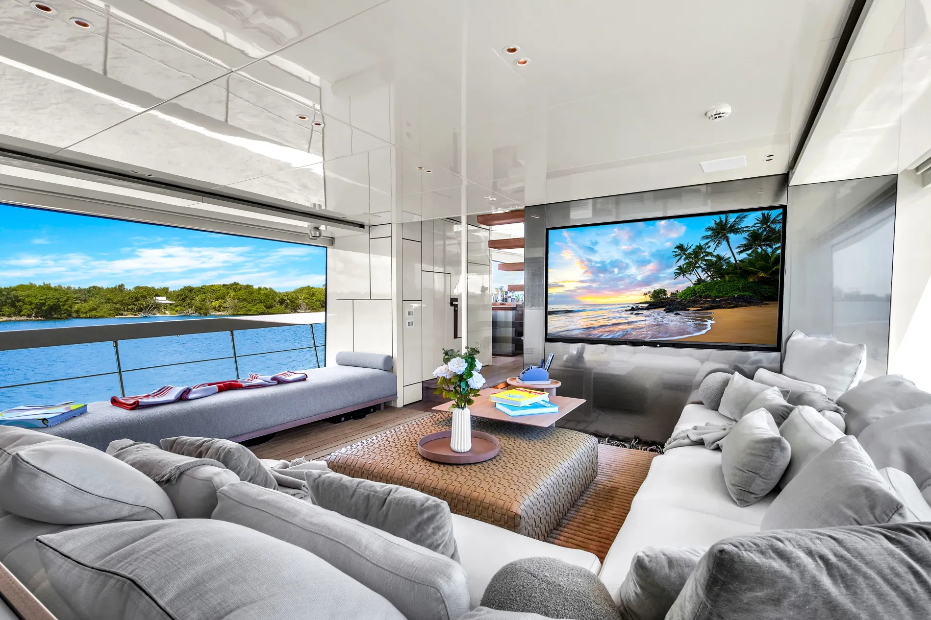 The SX88 offers a spacious aft deck that converts into a beach club, along with a flybridge and bow lounge designed for outdoor enjoyment.