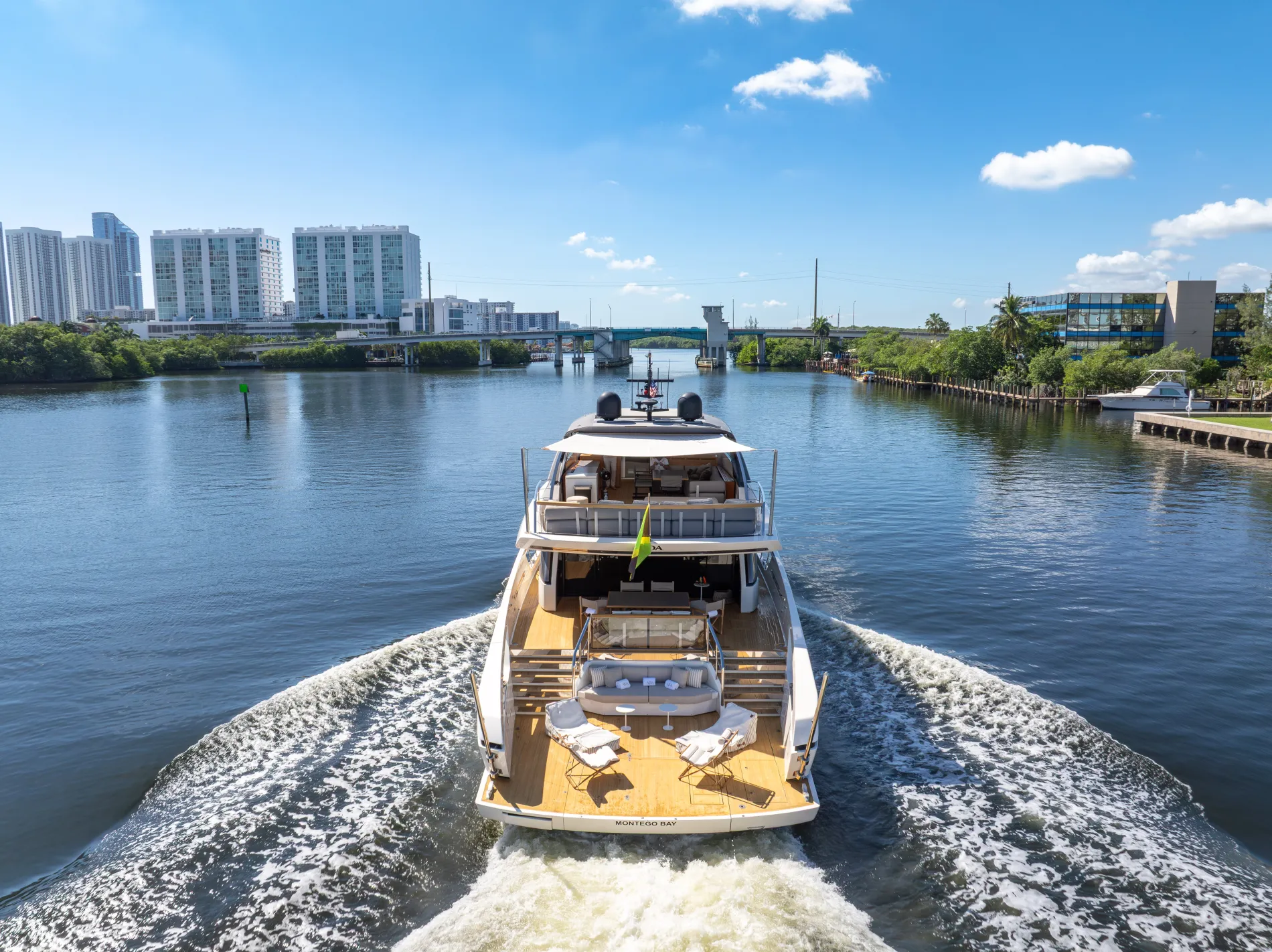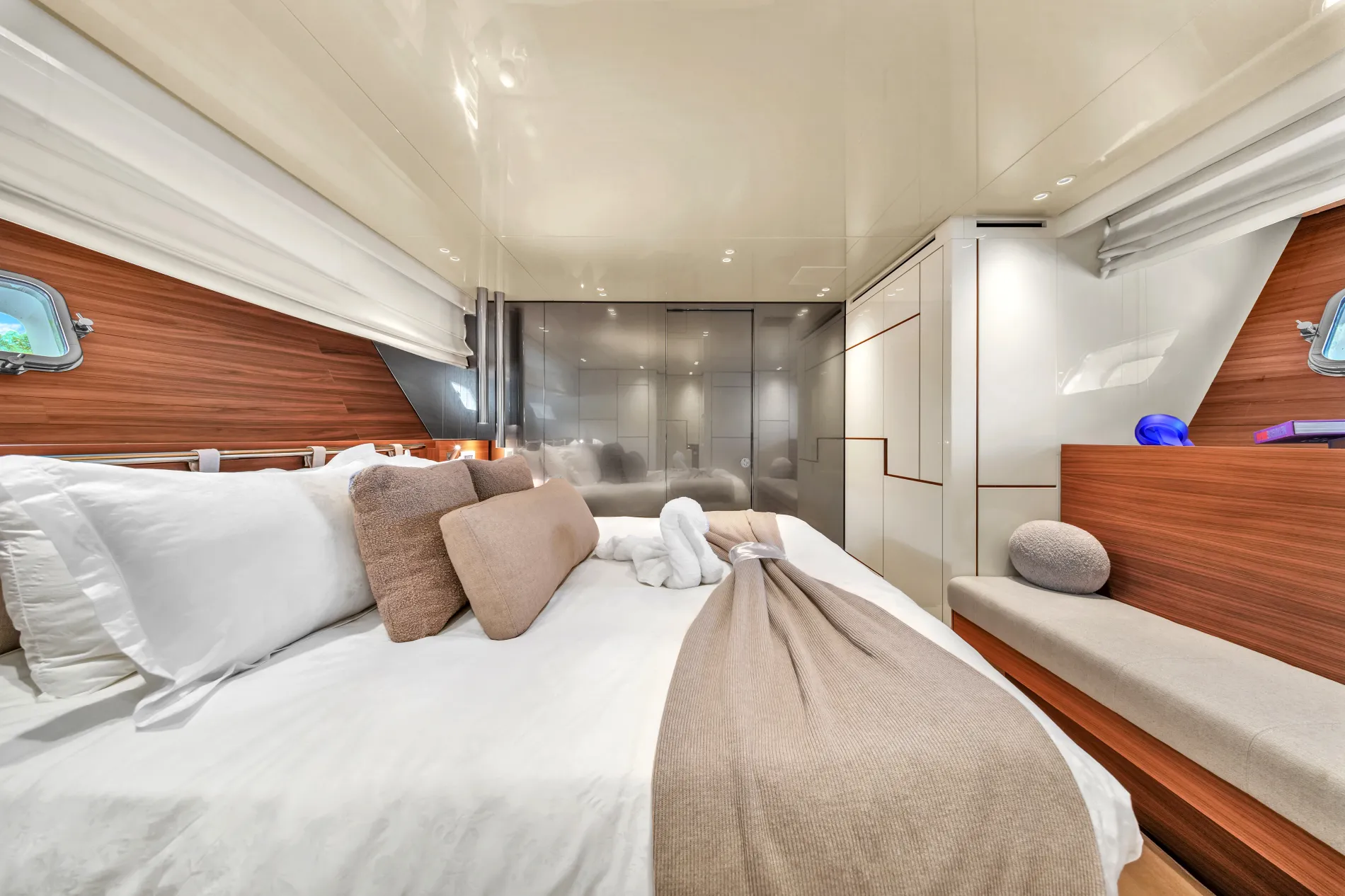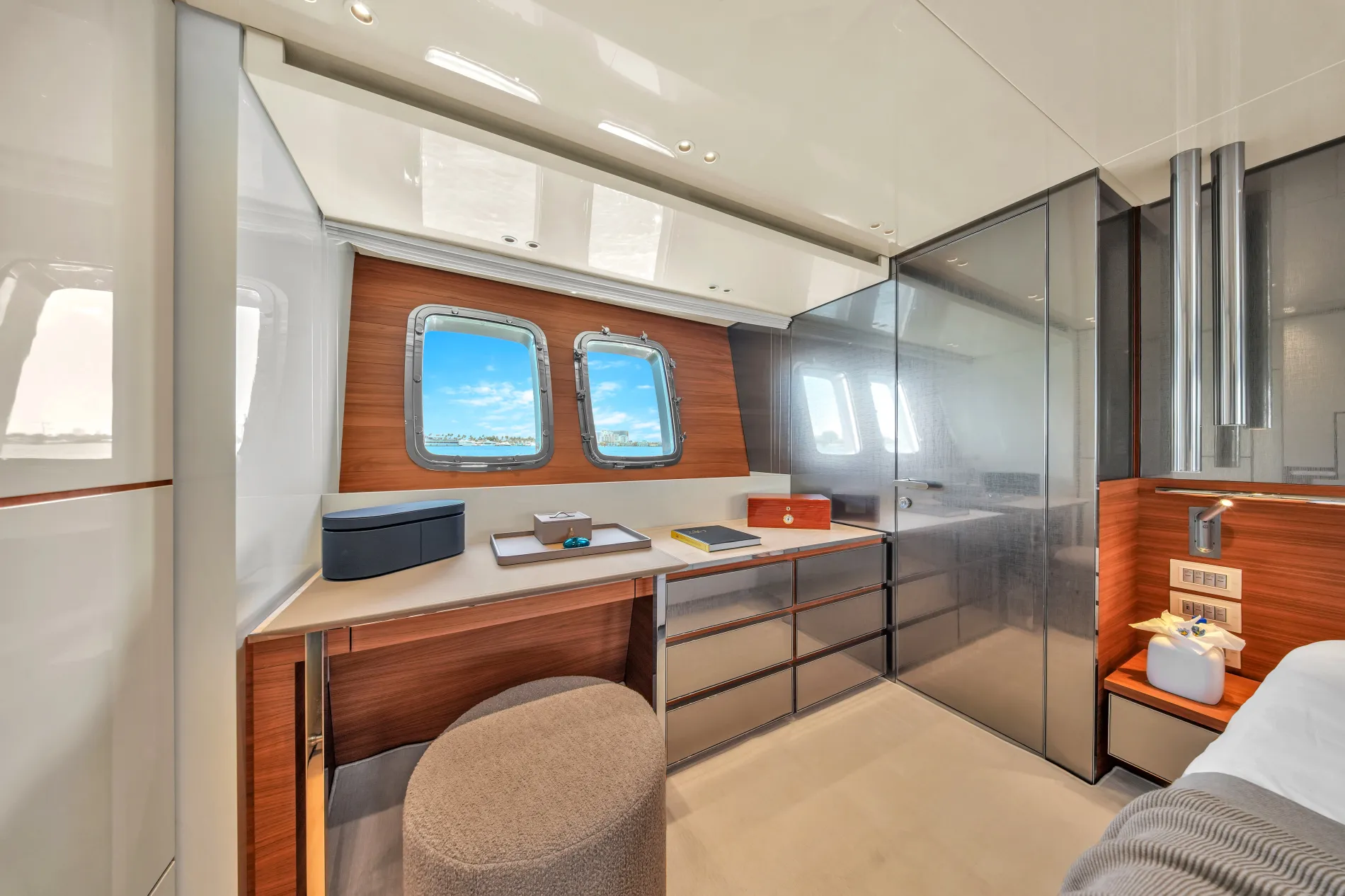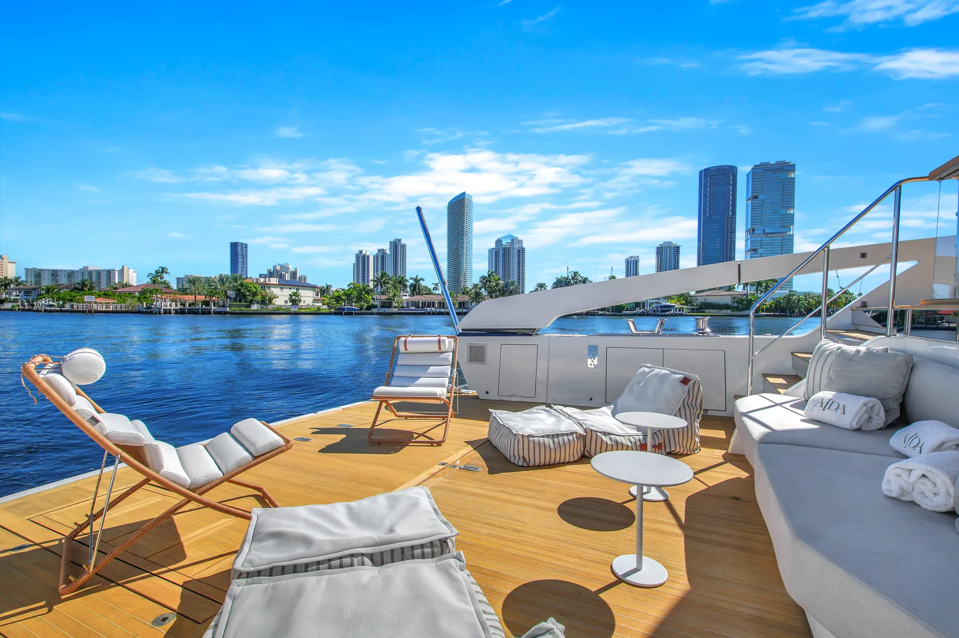 The SX88 offers a spacious aft deck that converts into a beach club, along with a flybridge and bow lounge designed for outdoor enjoyment.