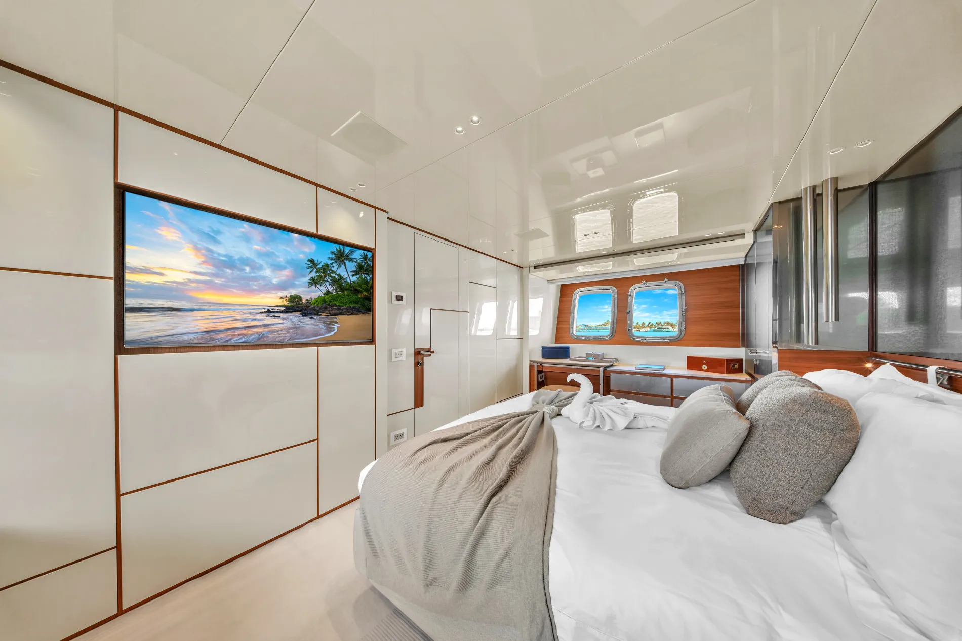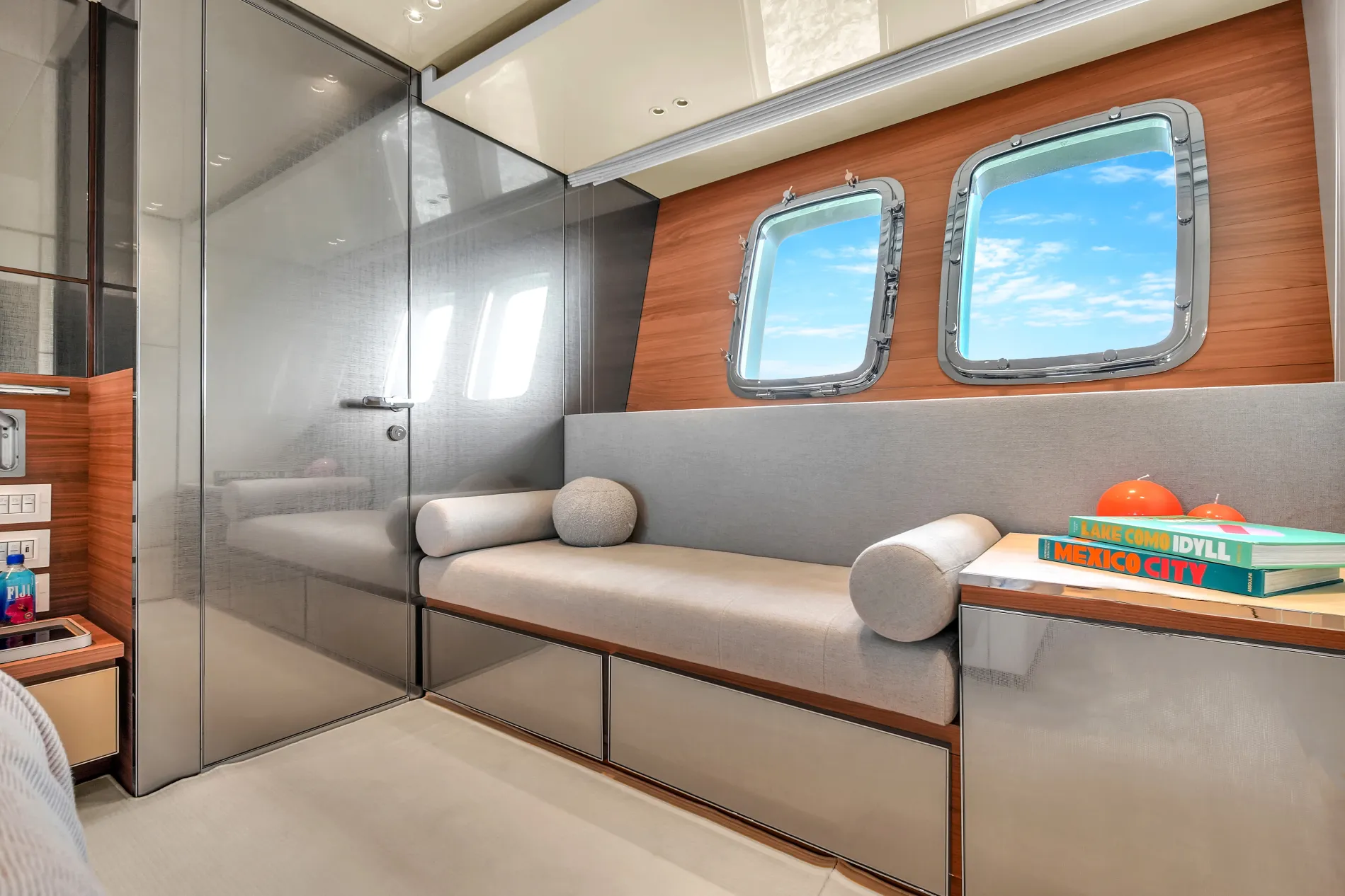 AIDA accommodates eight to ten guests across four cabins: a full-beam master suite, a VIP, and two guest cabins.