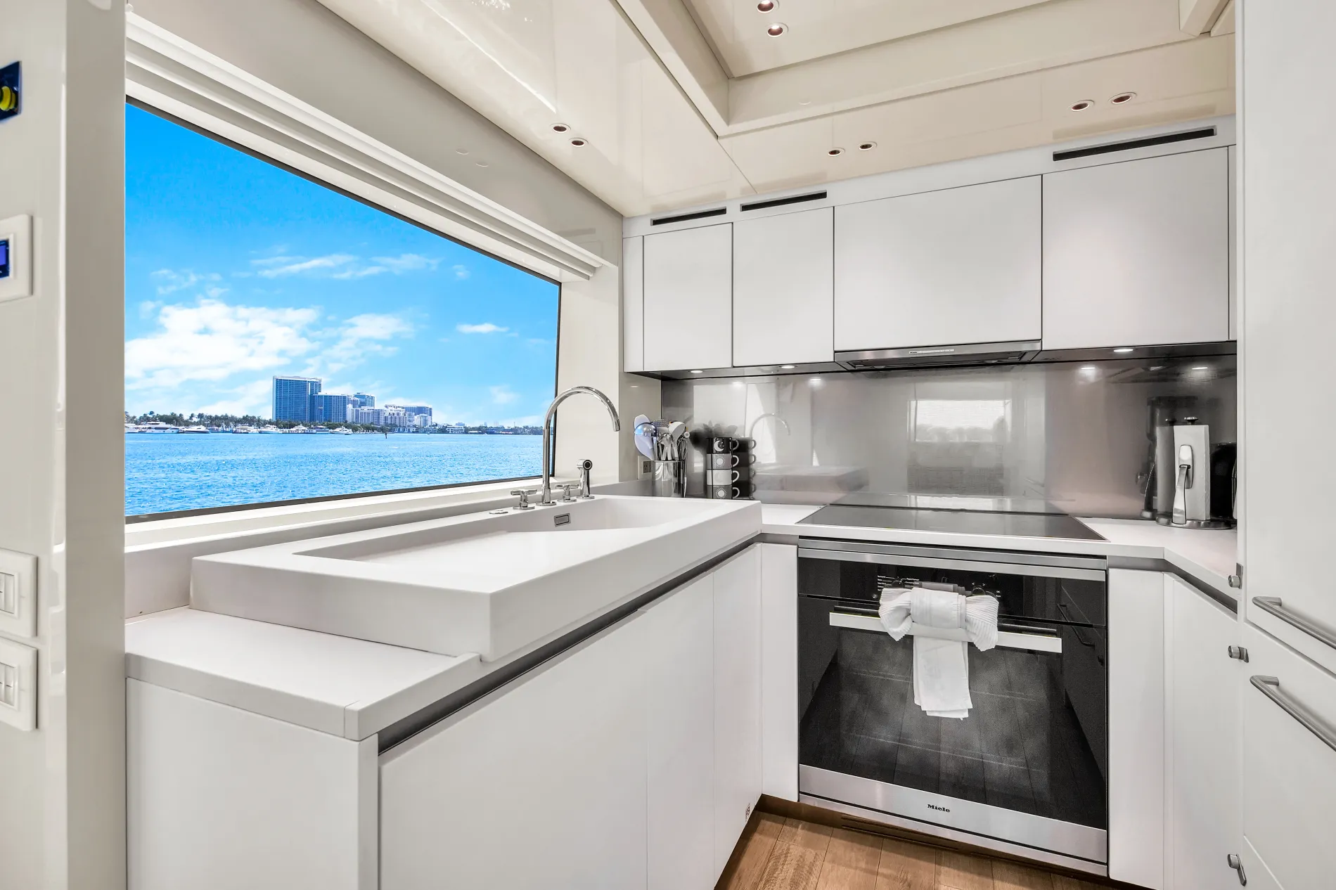 The galley is accessed separately via a dedicated crew entrance, while additional refrigeration supports extended stays. A washer and dryer in the guest area enhances day-to-day practicality.