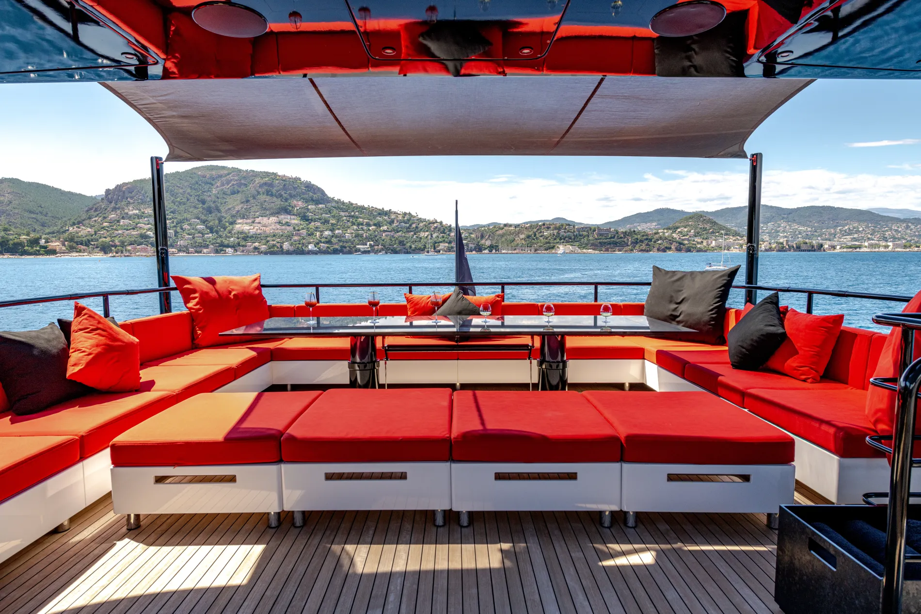The largest aft deck on any 50m, with a bar, BBQ, dining area and lounge with statement red cushions.