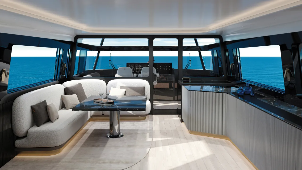 A flexible upper salon with a glass partition separating helm and lounge for added privacy.
