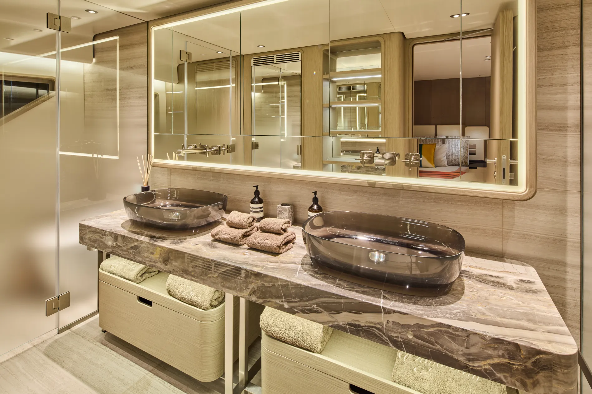 A full-beam main deck cabin with a king-size bed, dressing area and his-and-hers bathrooms finished in smoked glass and marble.