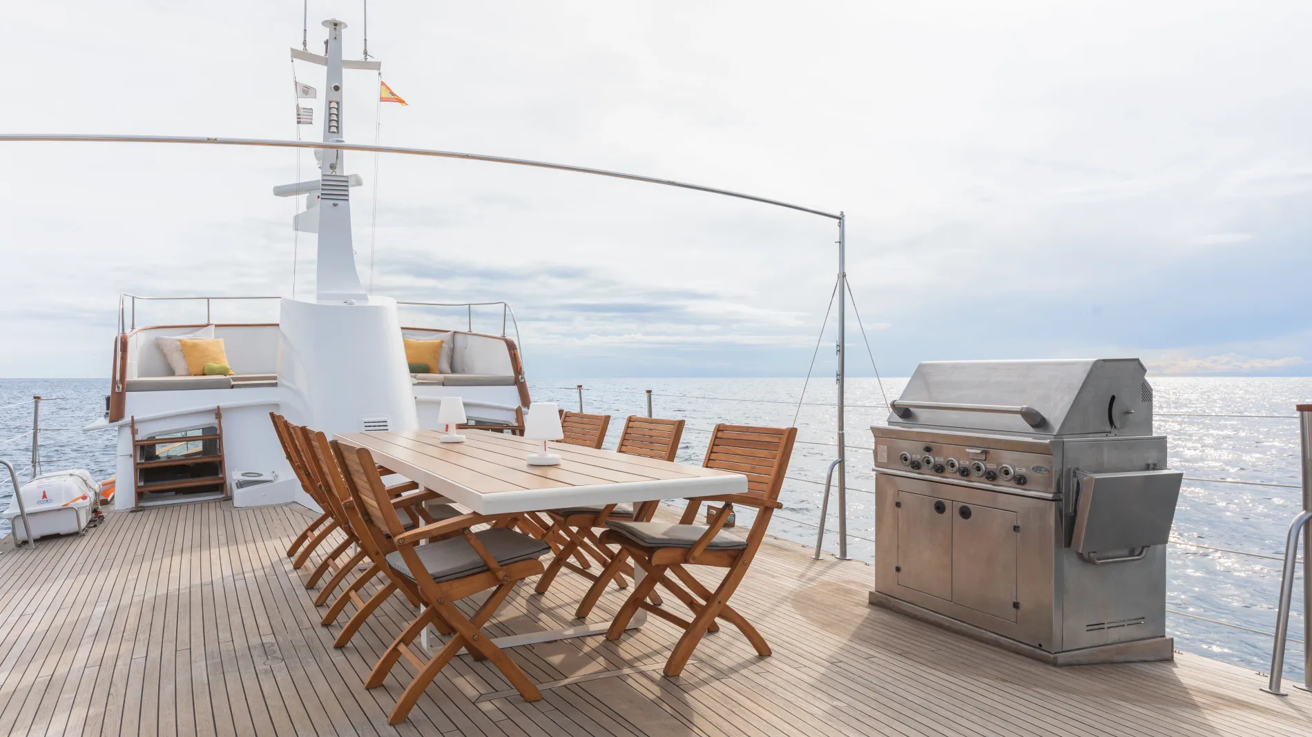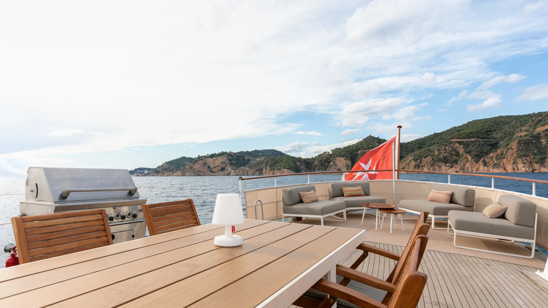 Fairmile offers exceptional space for her class with a fly deck featuring a barbecue, lounge, and dining for ten, plus additional seating on the aft deck and bow.