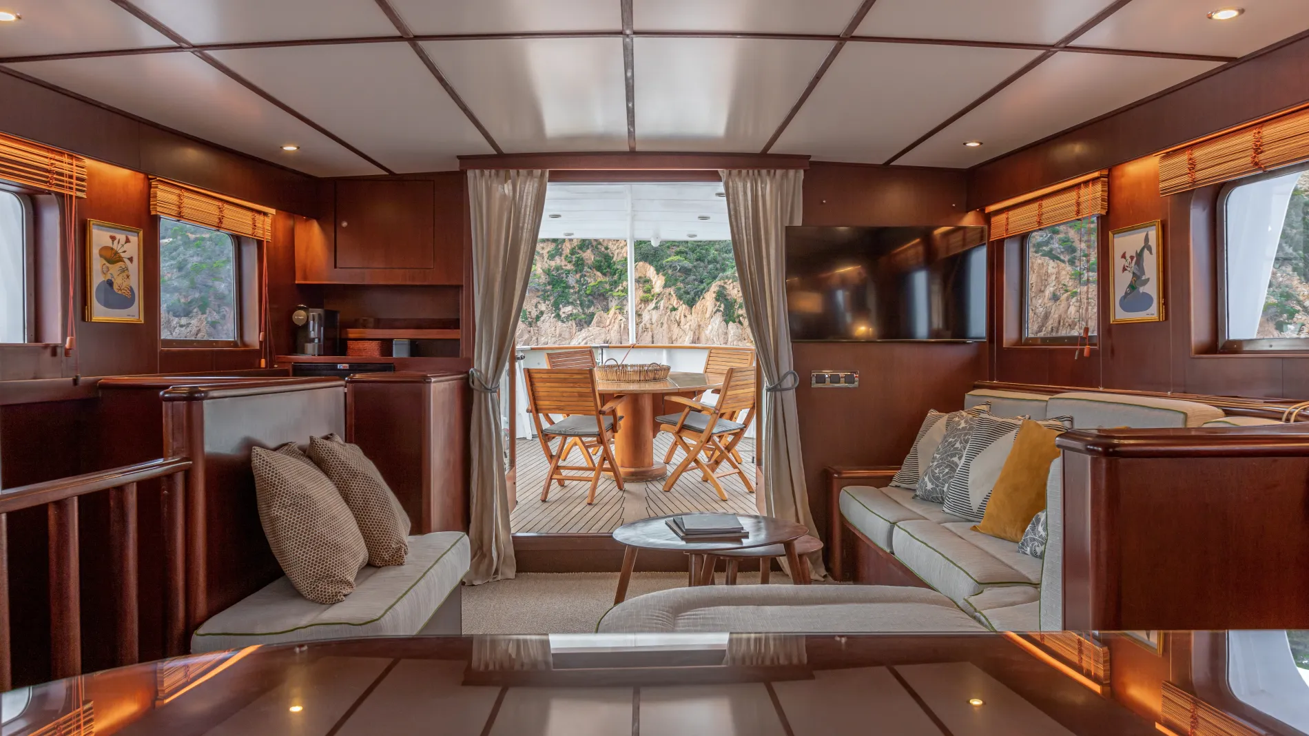 The main salon is the social heart of the yacht with an L-shaped sofa, a bar and a dining set-up.
