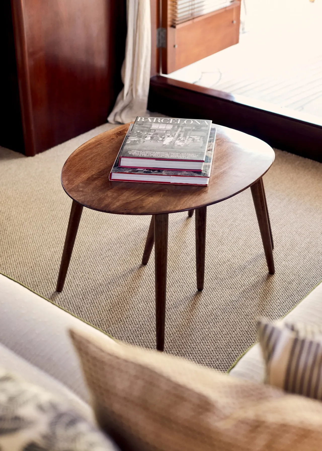 Primary suite with a double bed, sofa, and Samsung 7 Series 43” TV, finished in warm wood and cream tones.
