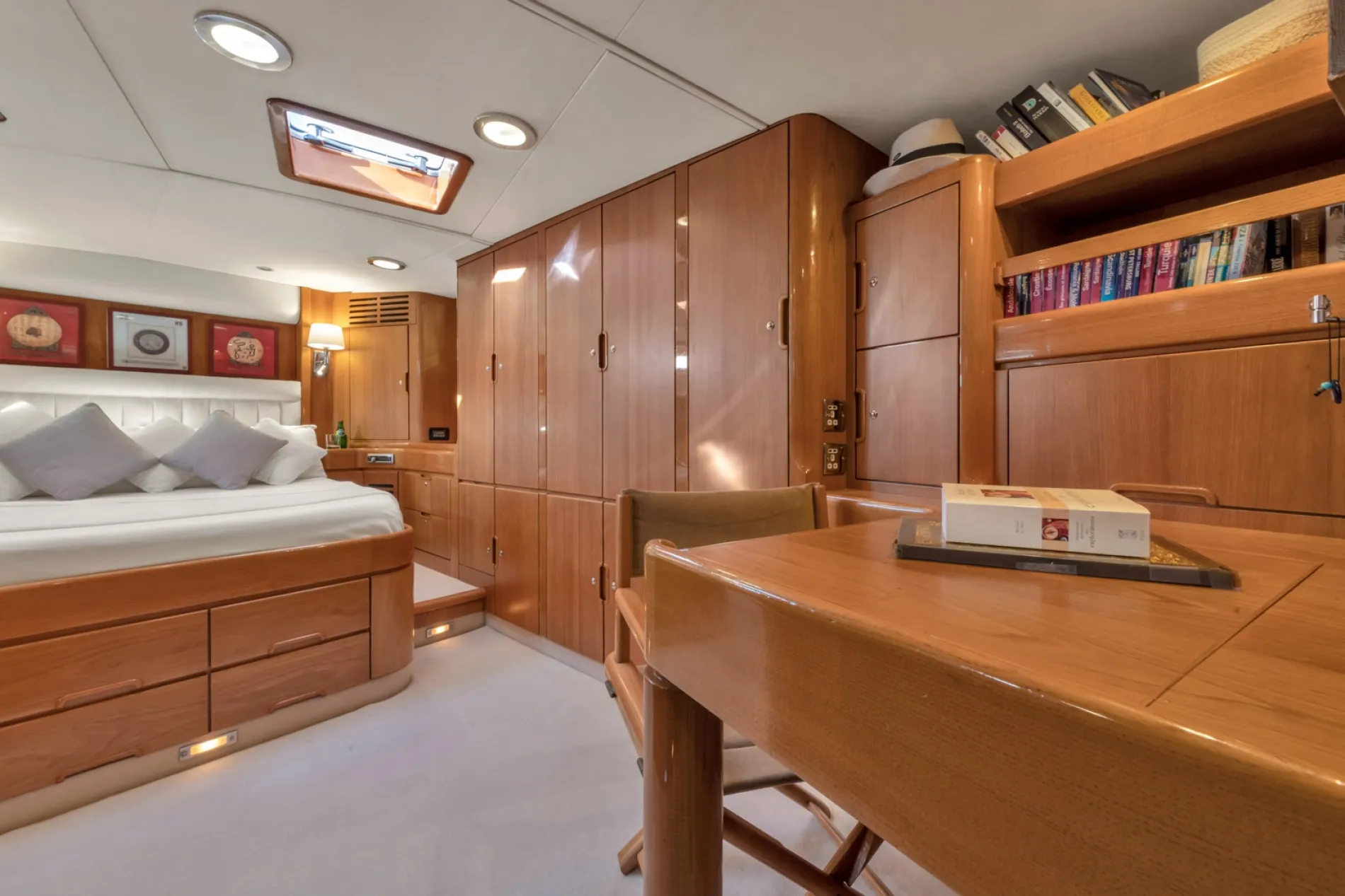 Located forward, the owner’s stateroom is spacious and private, with an en suite featuring a bathtub and shower.