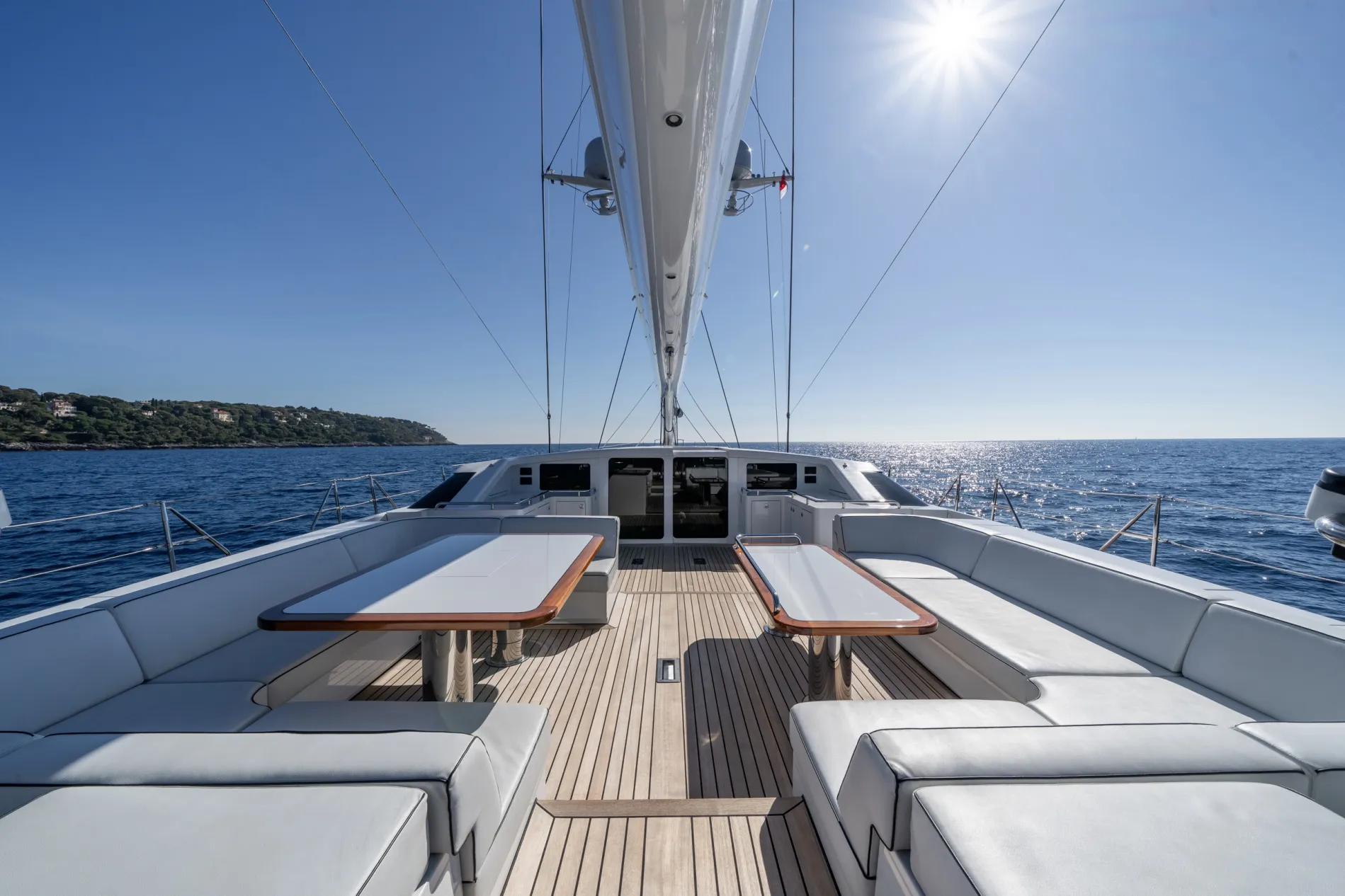 Twin sunpads are located aft of the main traveller, creating a relaxed lounging area with clear views astern.