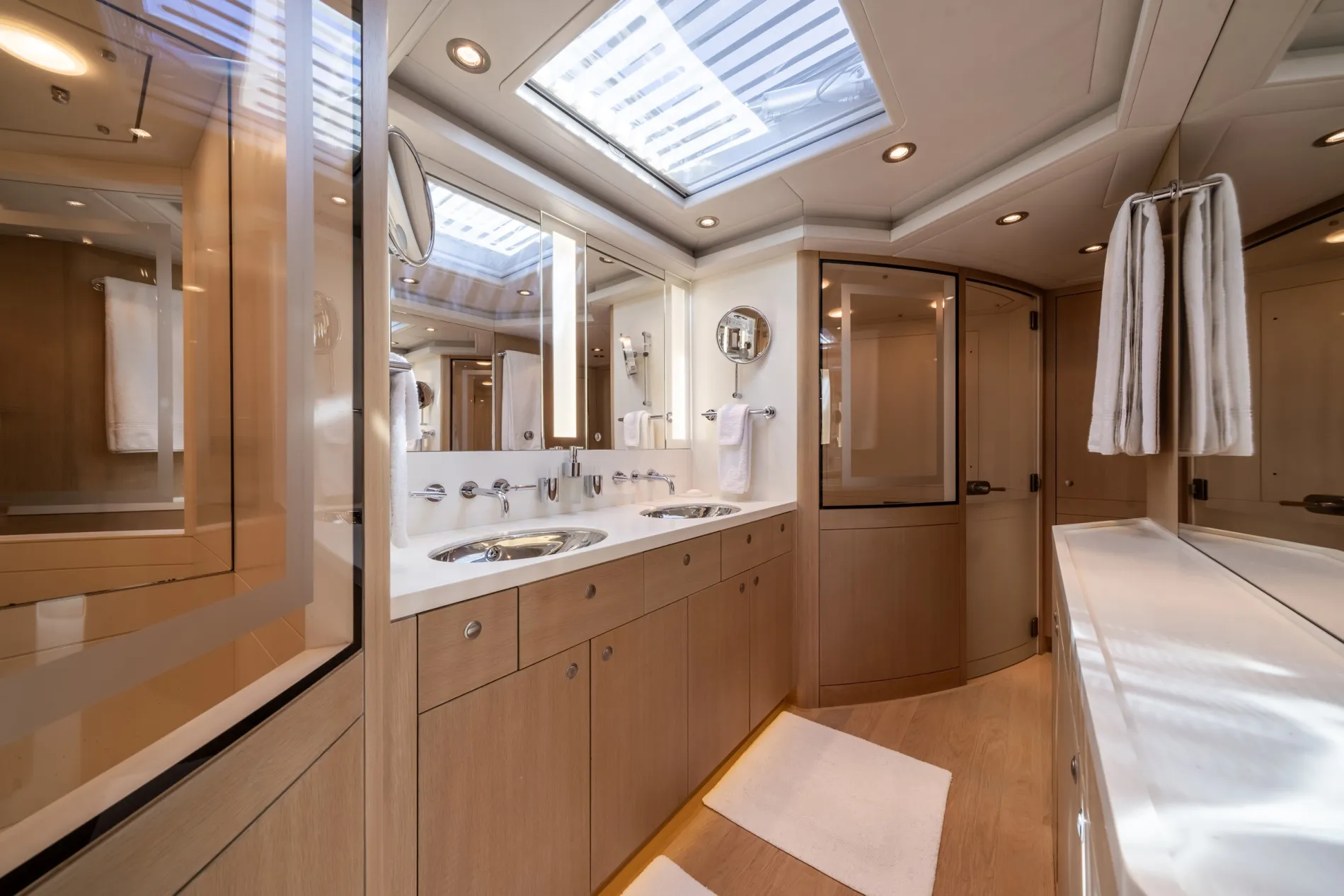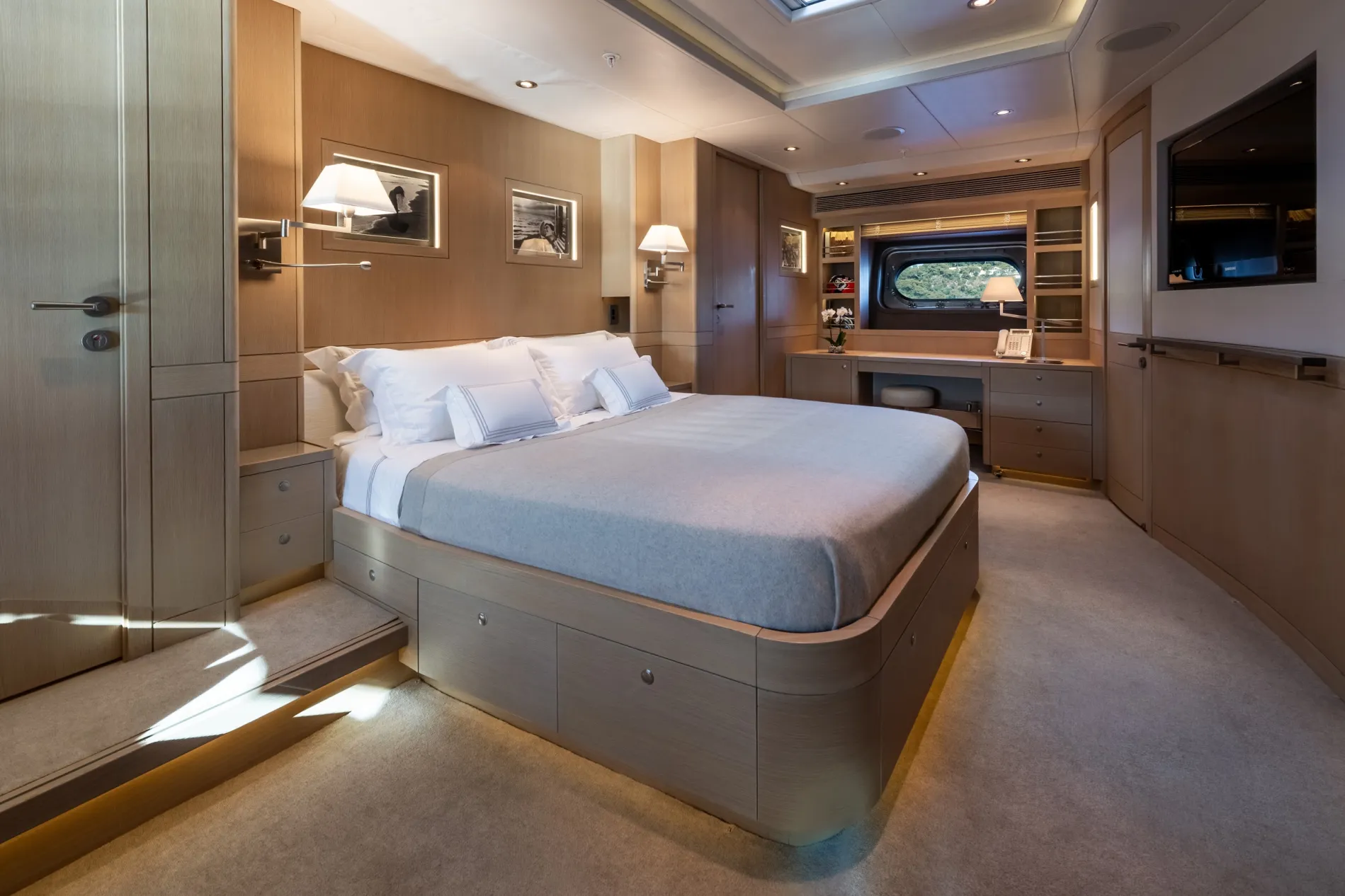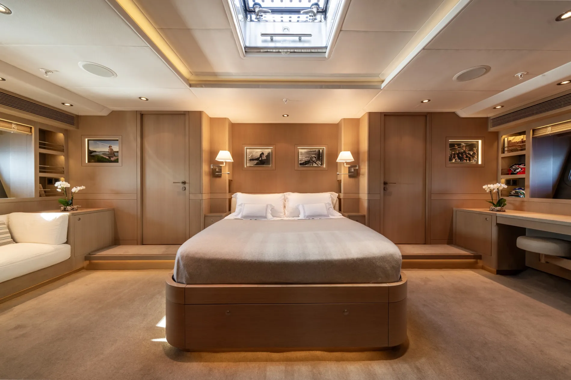 IMAGINE accommodates up to nine guests across four cabins, including a master suite, double cabin, twin cabin with a Pullman and a fourth cabin arranged as a single with a Pullman. The main salon sofa can also be converted into two additional berths if needed.