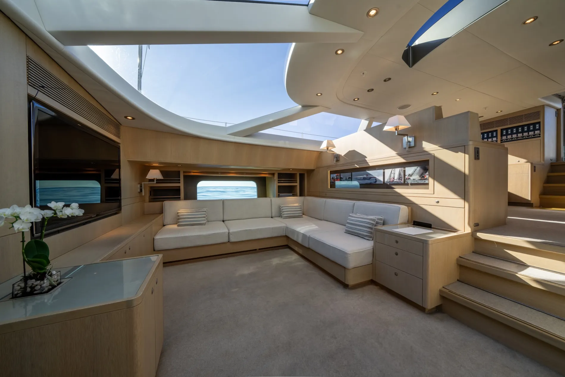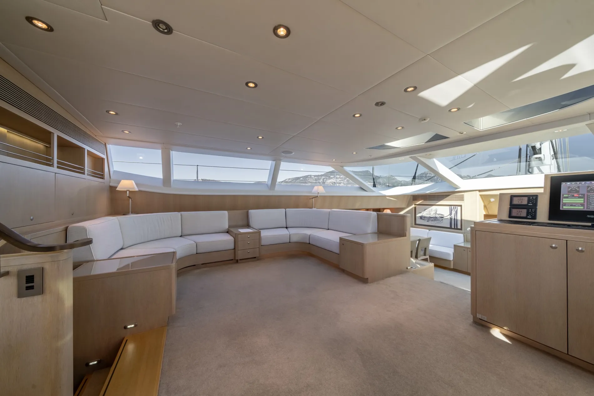 Accessed via an automated sliding companionway door, the raised upper salon is part of a split-level arrangement with a lounge to port and a navigation station to starboard.