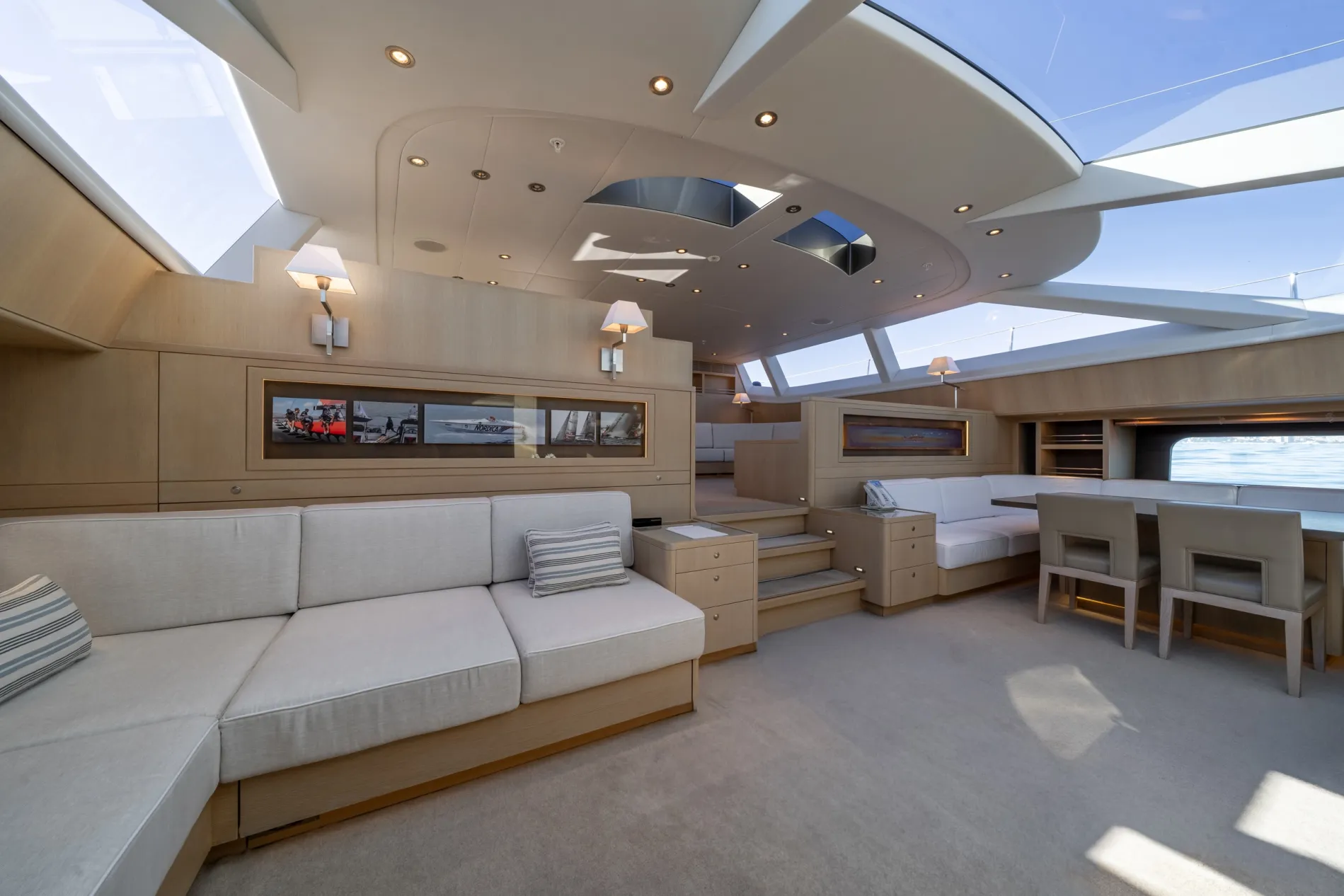 A few steps down, the lower salon features a dining area illuminated from above by the deckhouse windows.