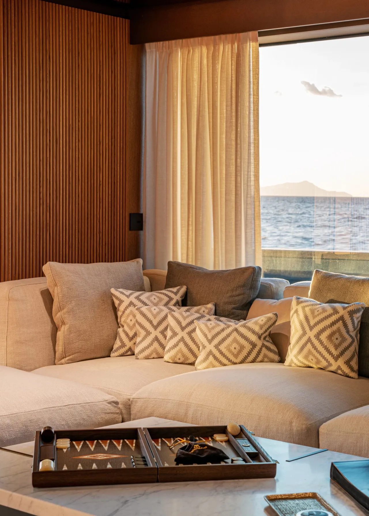 Large sliding doors open to the main salon, where leather armchairs, a low-slung sofa, and other contemporary furnishings create a stylish and inviting atmosphere.