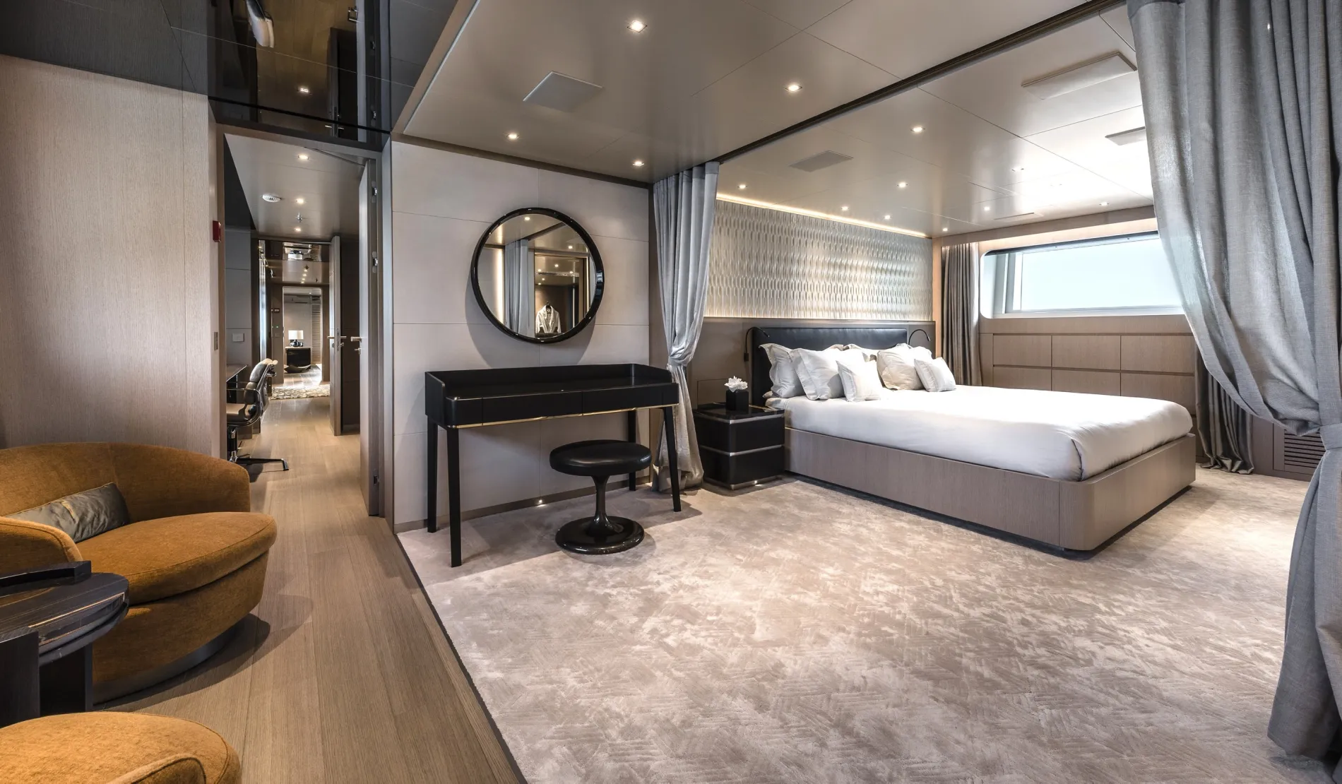 A full-beam VIP stateroom on the main deck mirrors the scale and detailing of the owner’s suite.