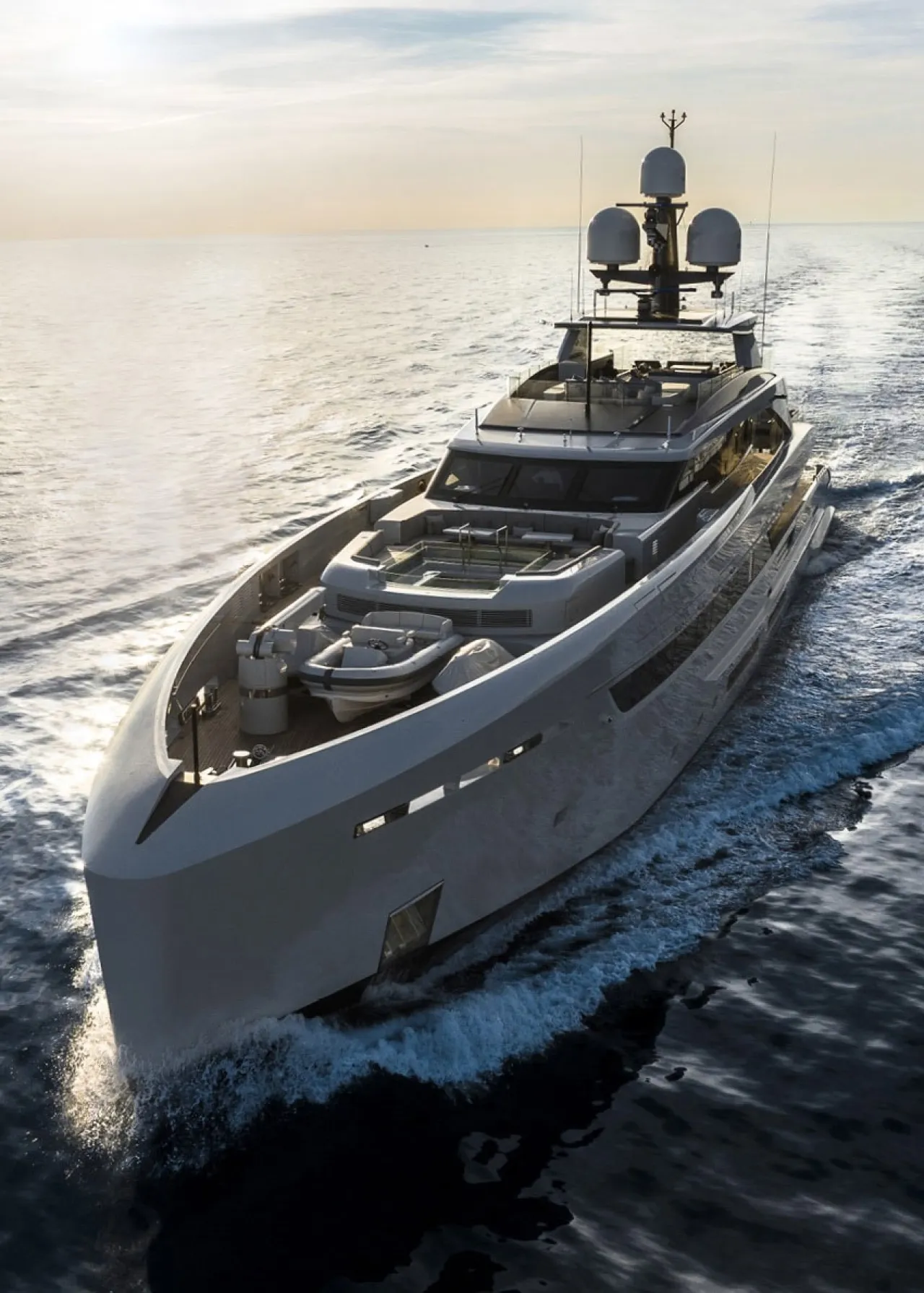 Francesco Paszkowski’s exterior architecture maintains the low-rise profile of the S501 series, characterised by a vertical bow, expansive windows and a generous stern swim platform.