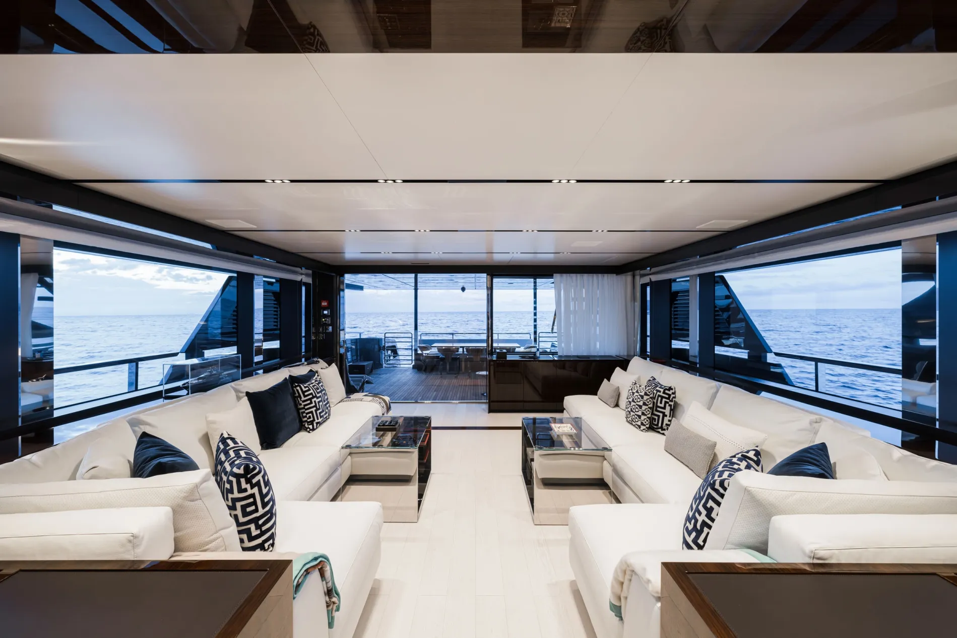 Offering 23 percent more area than comparable yachts in this class, the upper aft deck is a flexible space, configured for dining.
