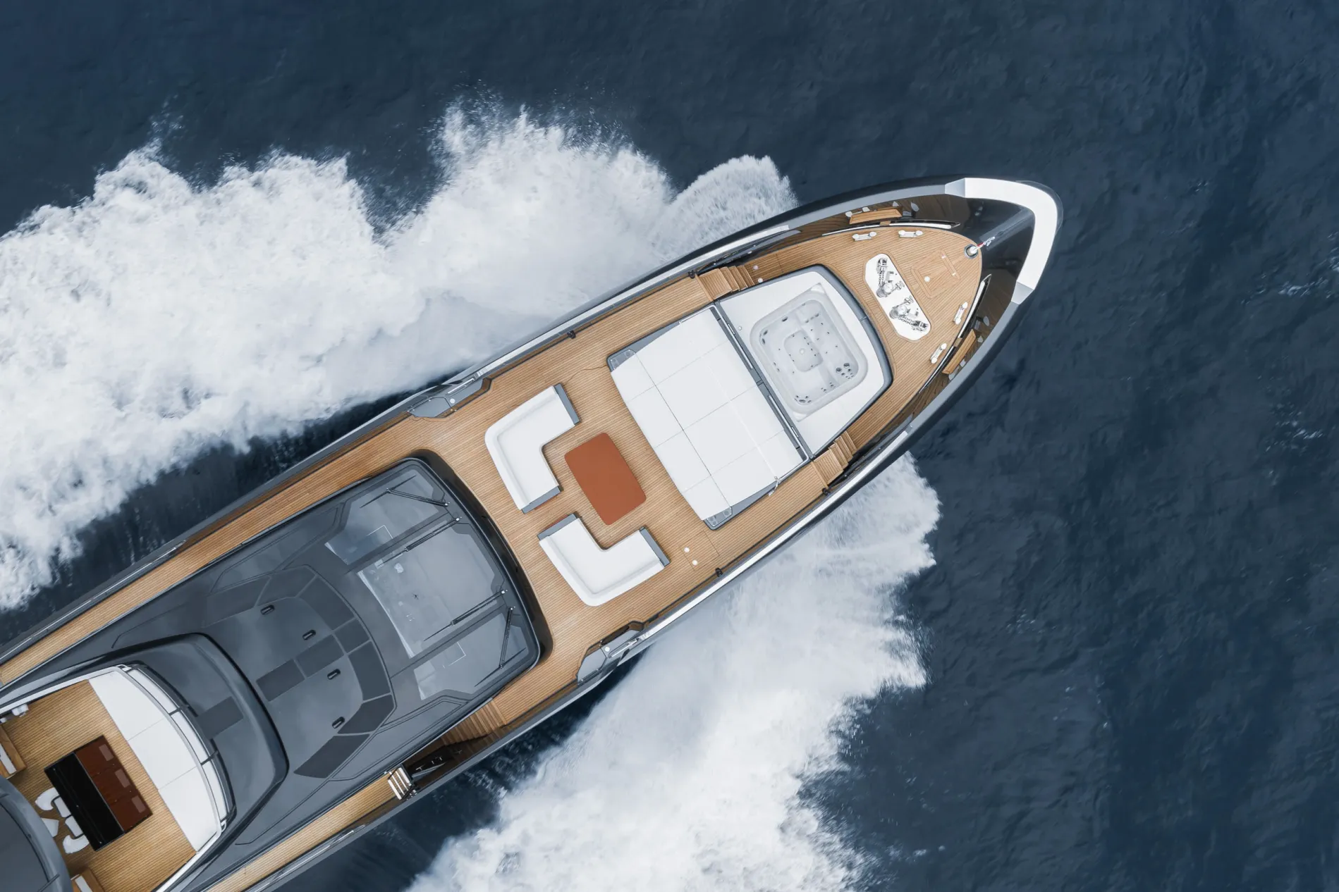 A 60m² beach club marked an evolution in Riva’s flybridge range, introducing an open, multi-level stern configuration by relocating the tender to a dedicated side garage.