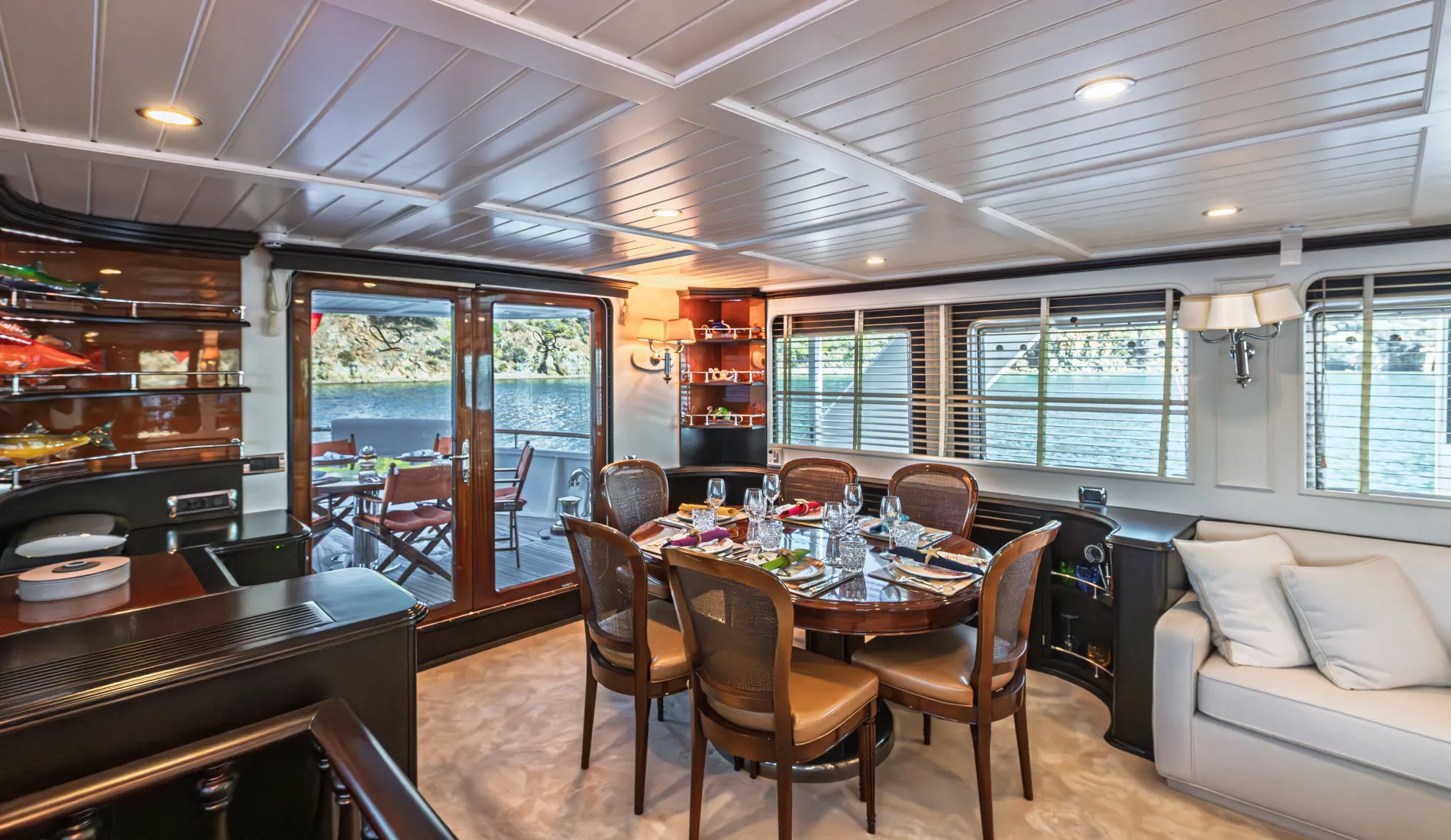 A spacious open dining area is set within her canoe stern.