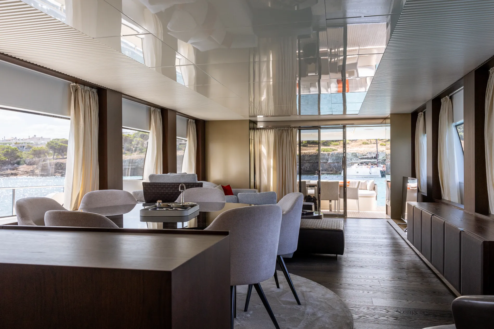 Twin MAN 1,800 HP engines provide the power, while two Seakeeper units deliver zero speed stabilisation and bow and stern thrusters support manoeuvrability in closer quarters. A Williams JetRib is included in the sale.