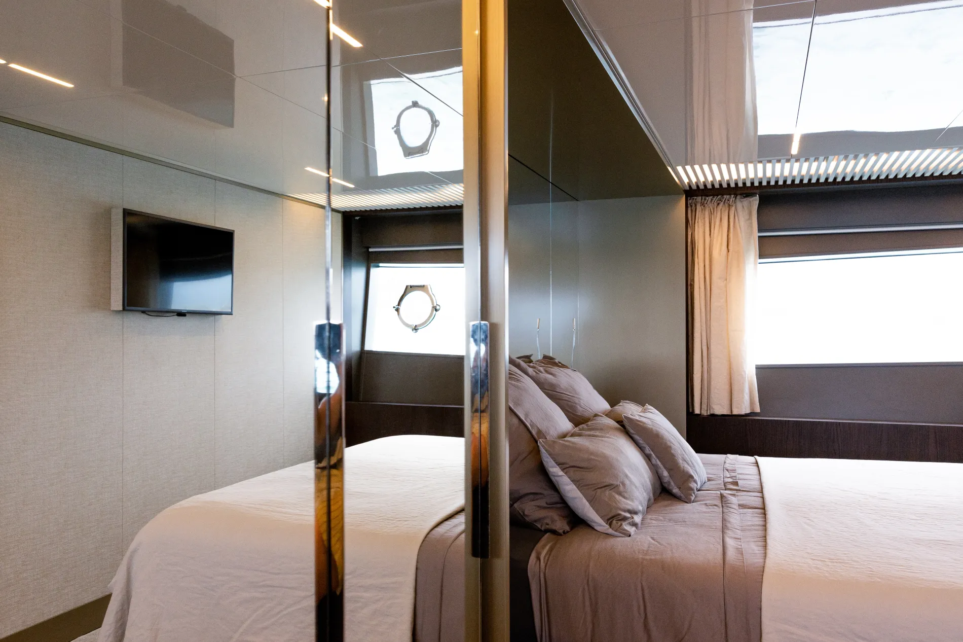 A full-beam owner’s suite with a double bed, en suite, and upgraded soundproofing from the engine room, creating a more comfortable space underway and at anchor.