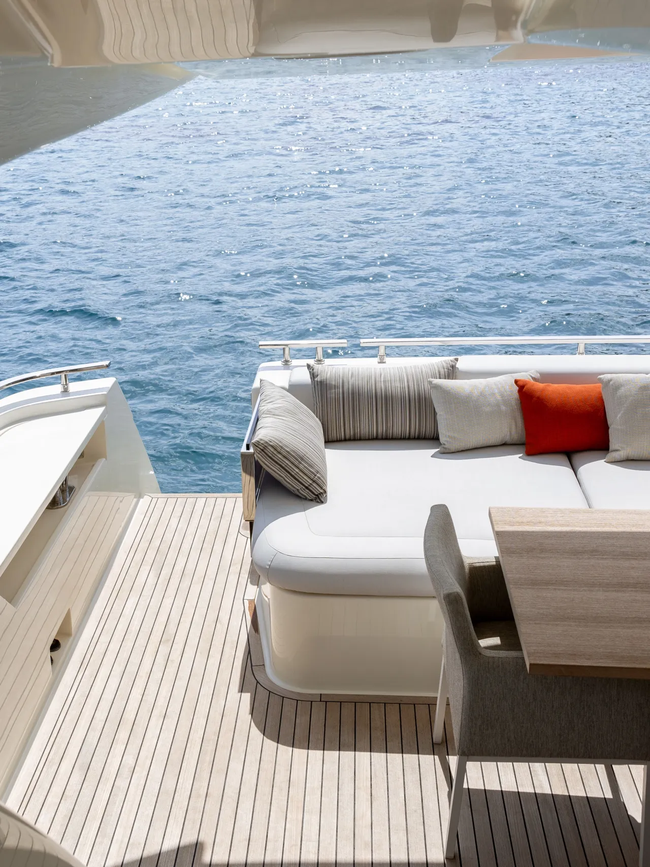 The aft cockpit is set up for relaxed dining, creating an easy connection between the main deck salon and the water.