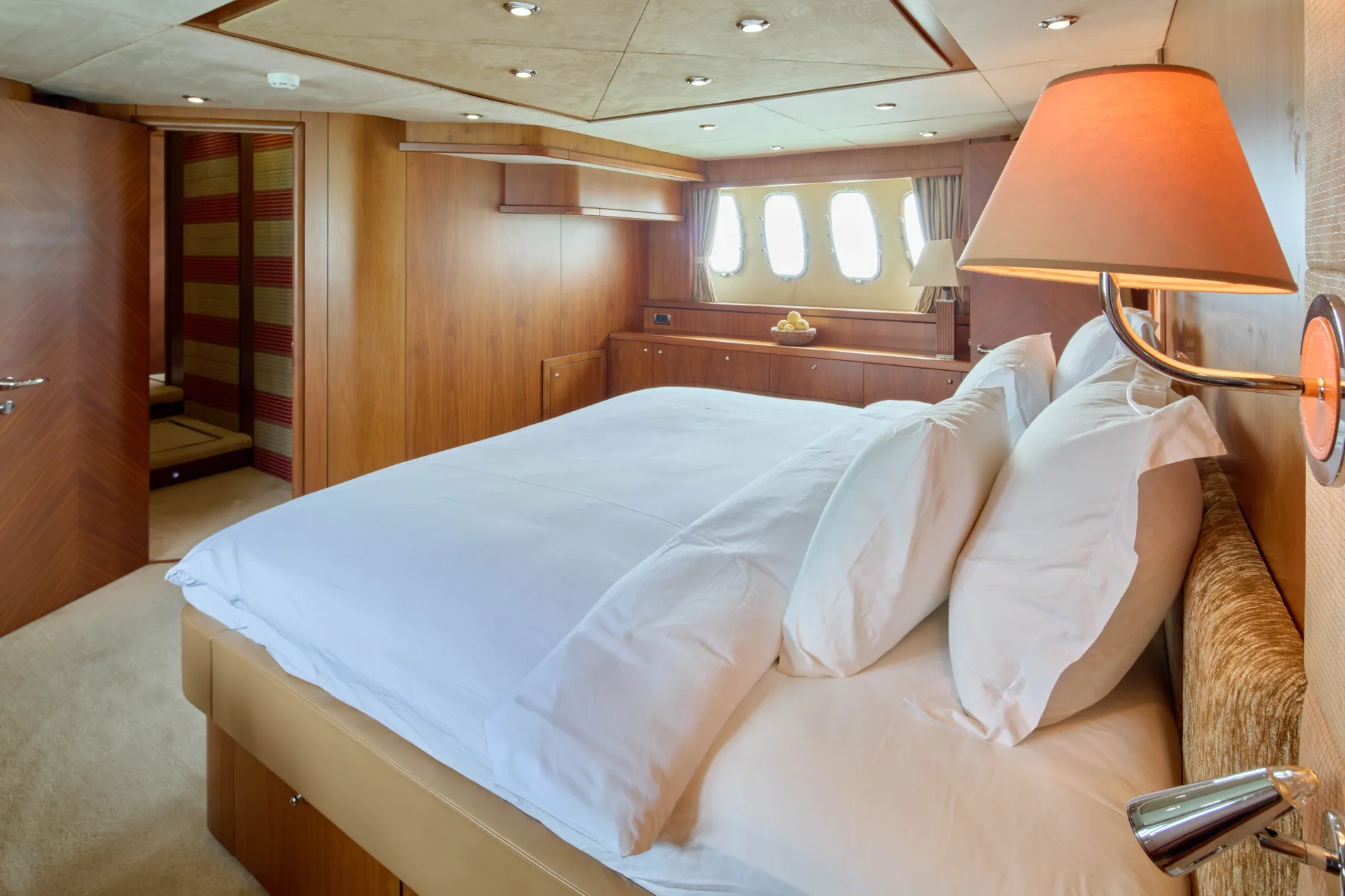 Accommodation is arranged on the lower deck in a practical four-cabin layout, with all cabins en suite. Crew quarters arranged aft and accessed independently from the exterior.