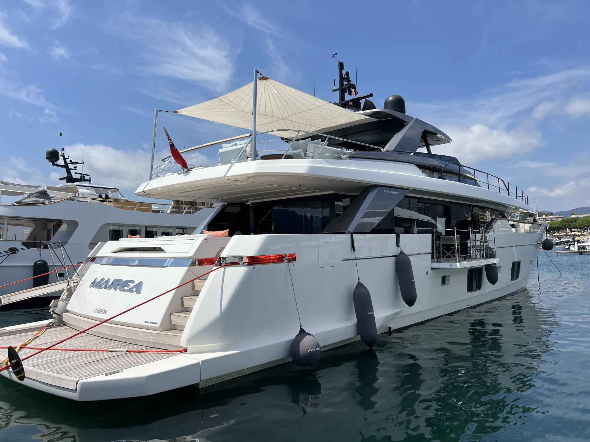 A hydraulic swim platform lowers to the water, while the transom opens to reveal a tender garage and toy stowage.