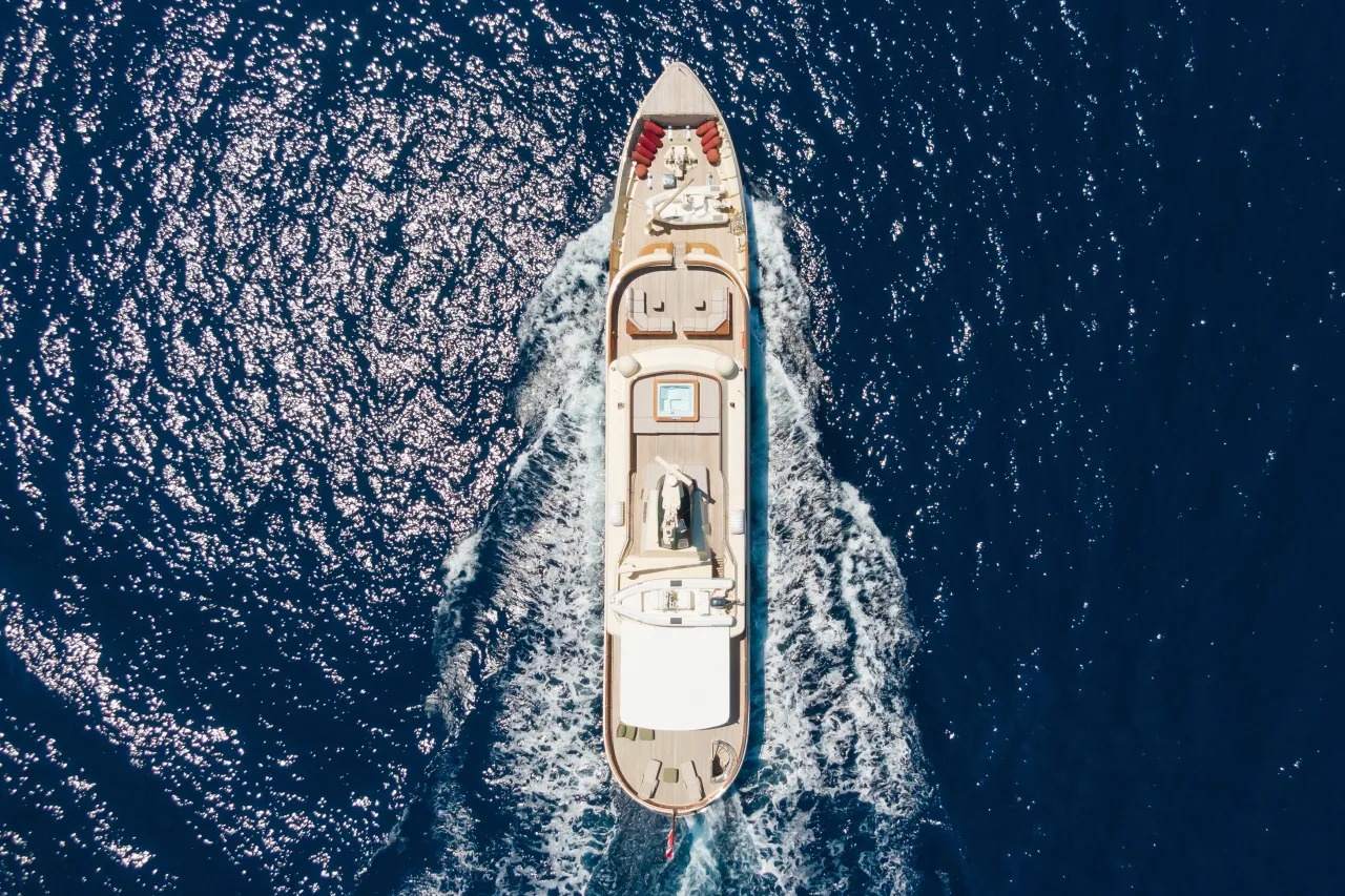 Meserret’s emerald-green hull and classic canoe stern capture the elegance of a bygone era. With lounges across every deck and wide side decks for easy circulation, she balances a naturally social spirit with timeless grace.