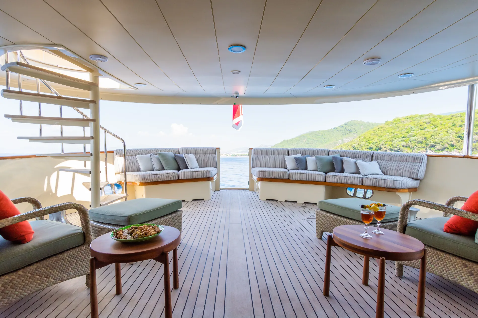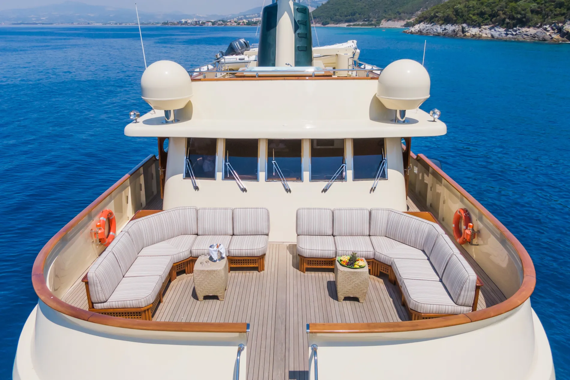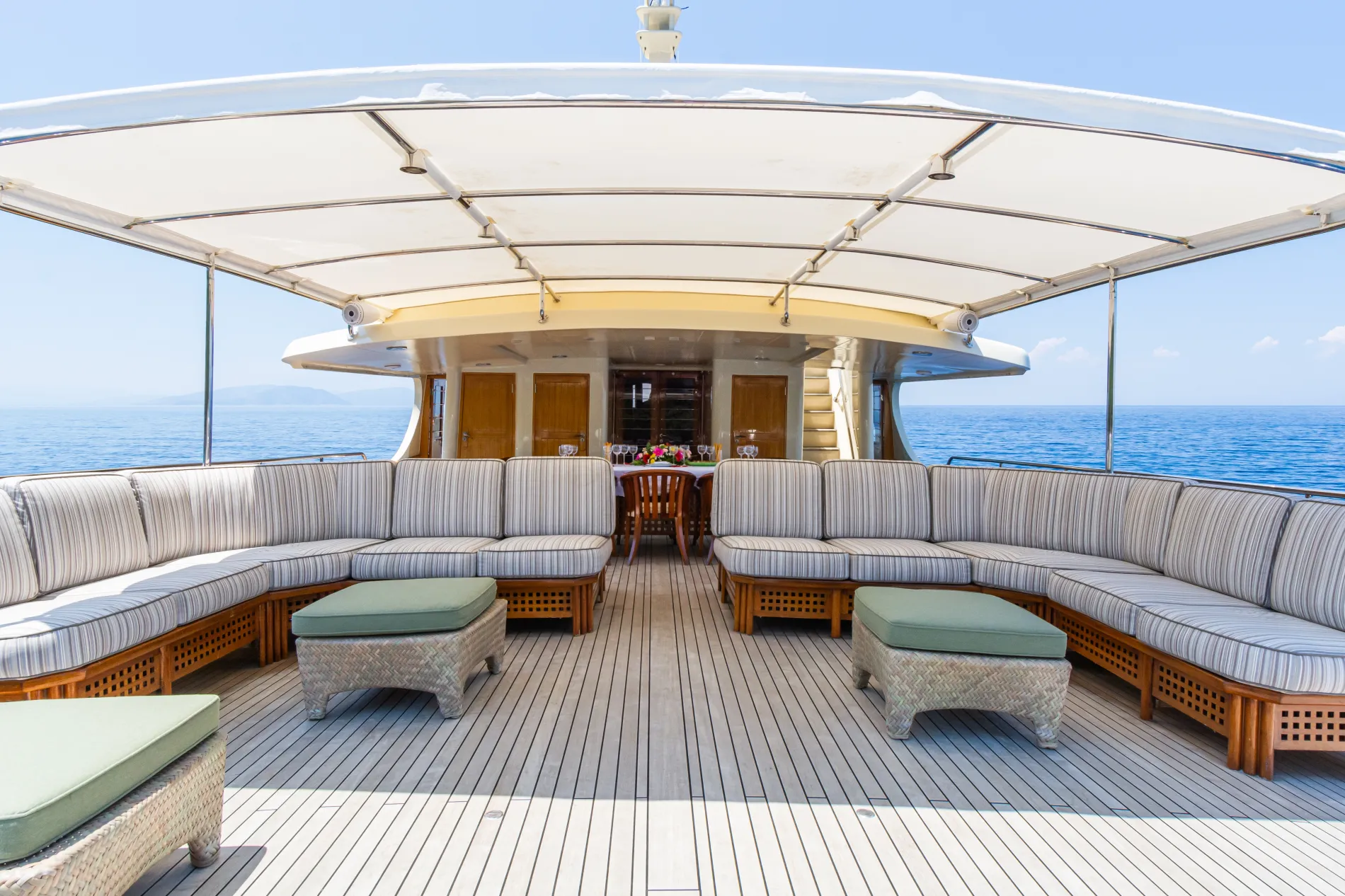 A shaded retreat with built-in sofas hugging the curve of the stern, complemented by flexible loose furniture.