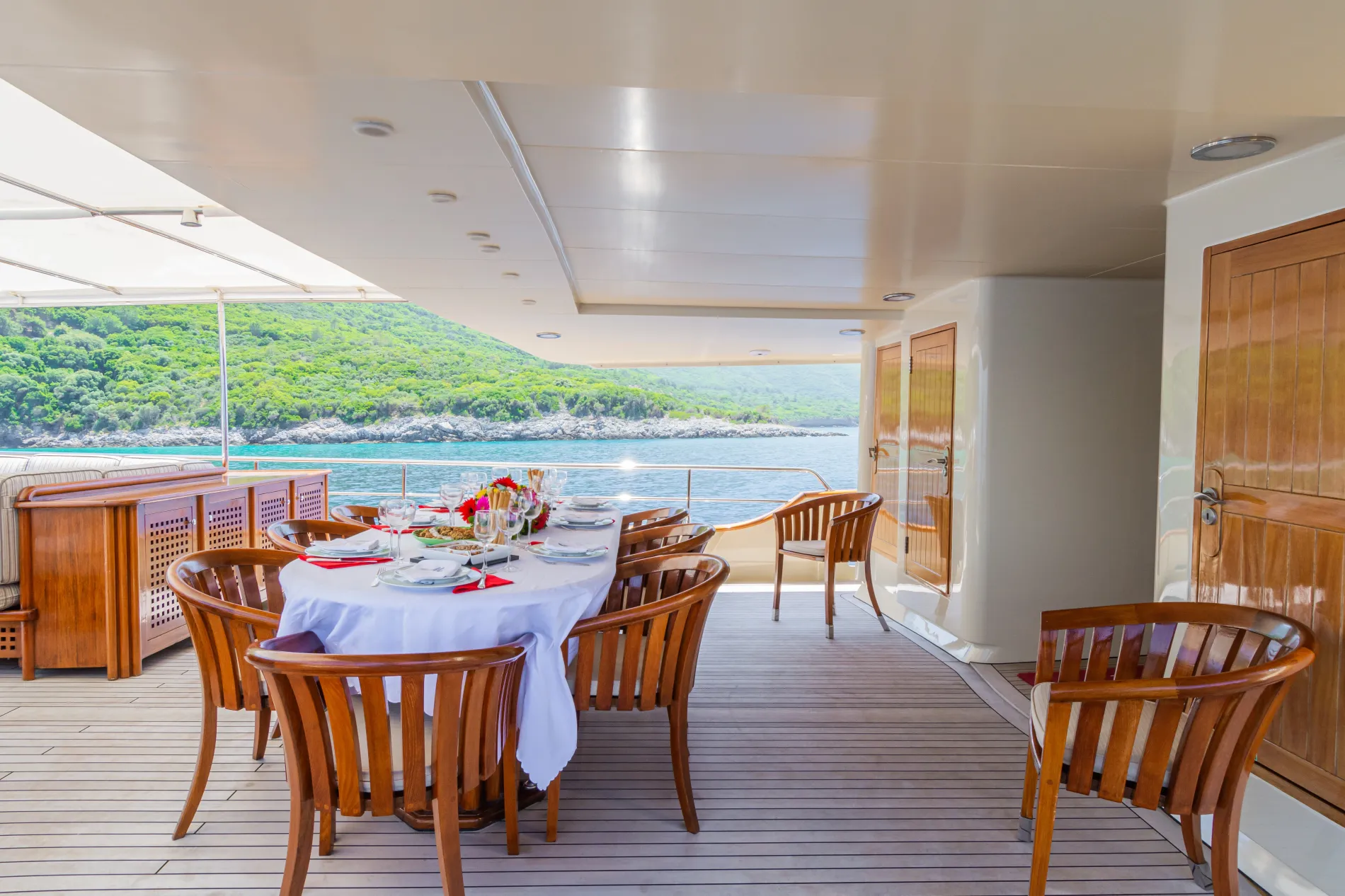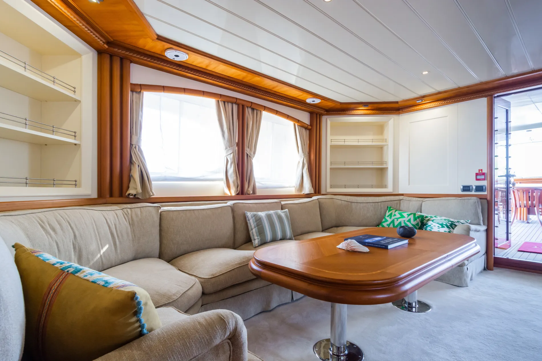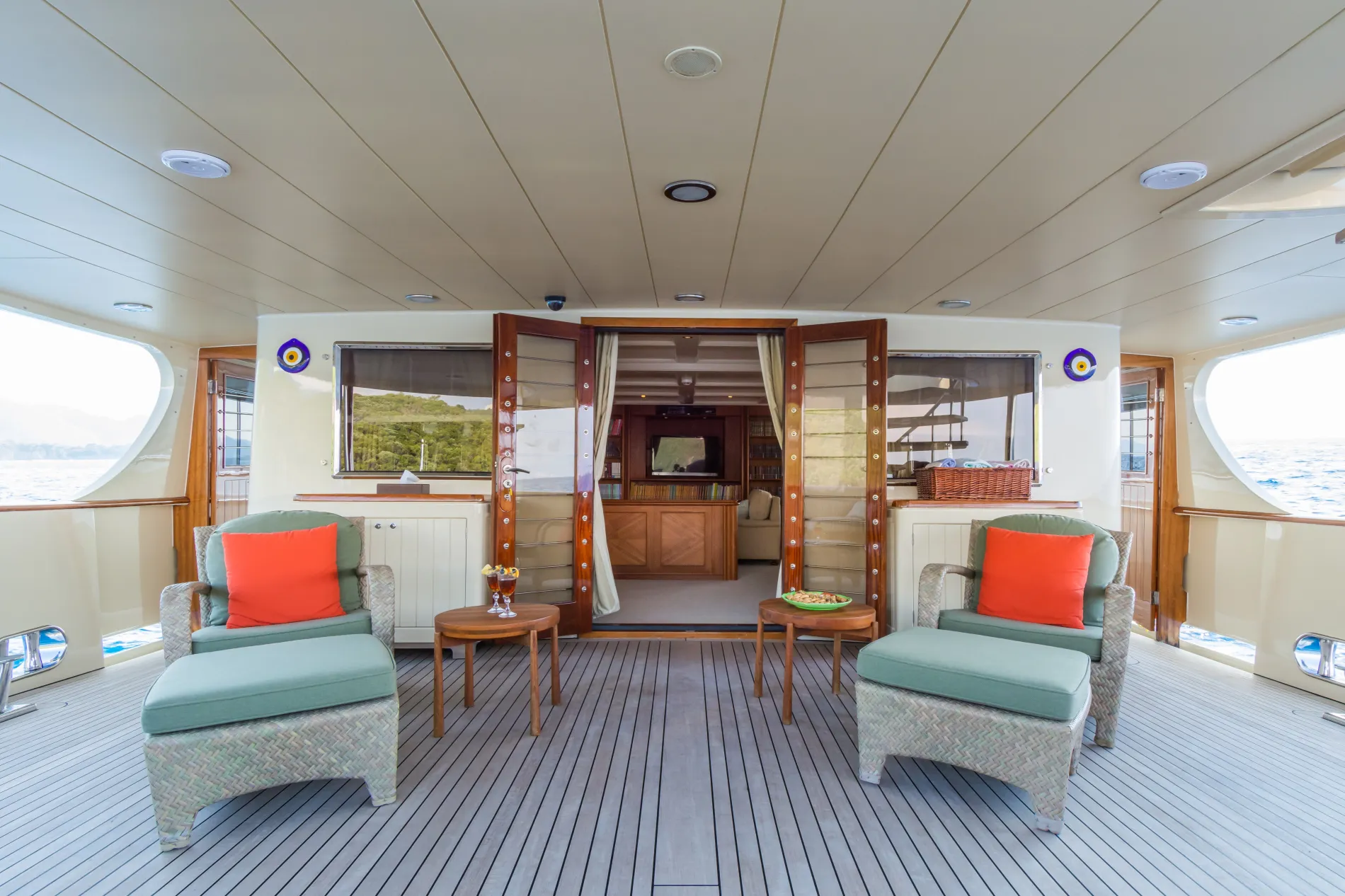 A shaded retreat with built-in sofas hugging the curve of the stern, complemented by flexible loose furniture.