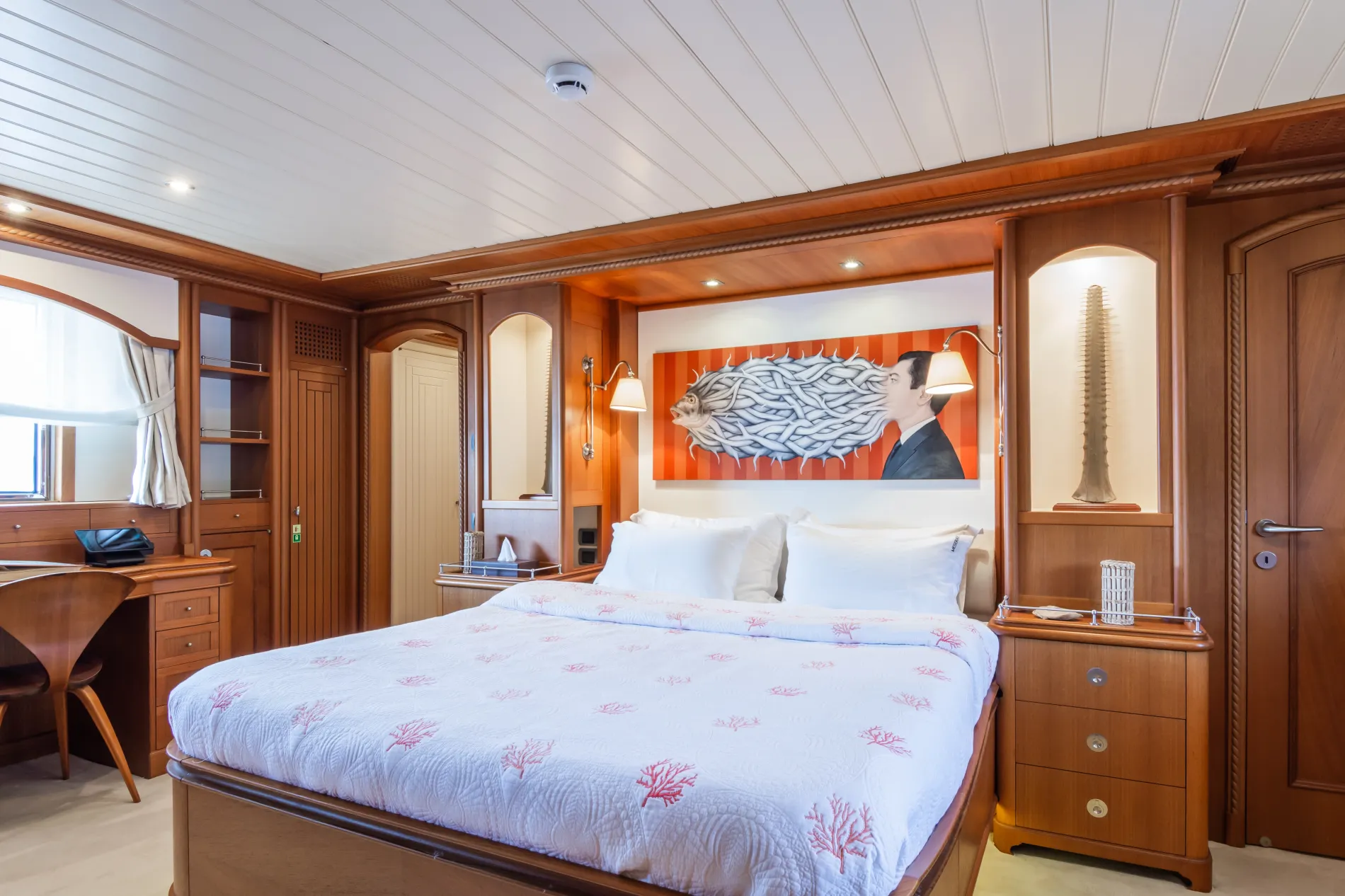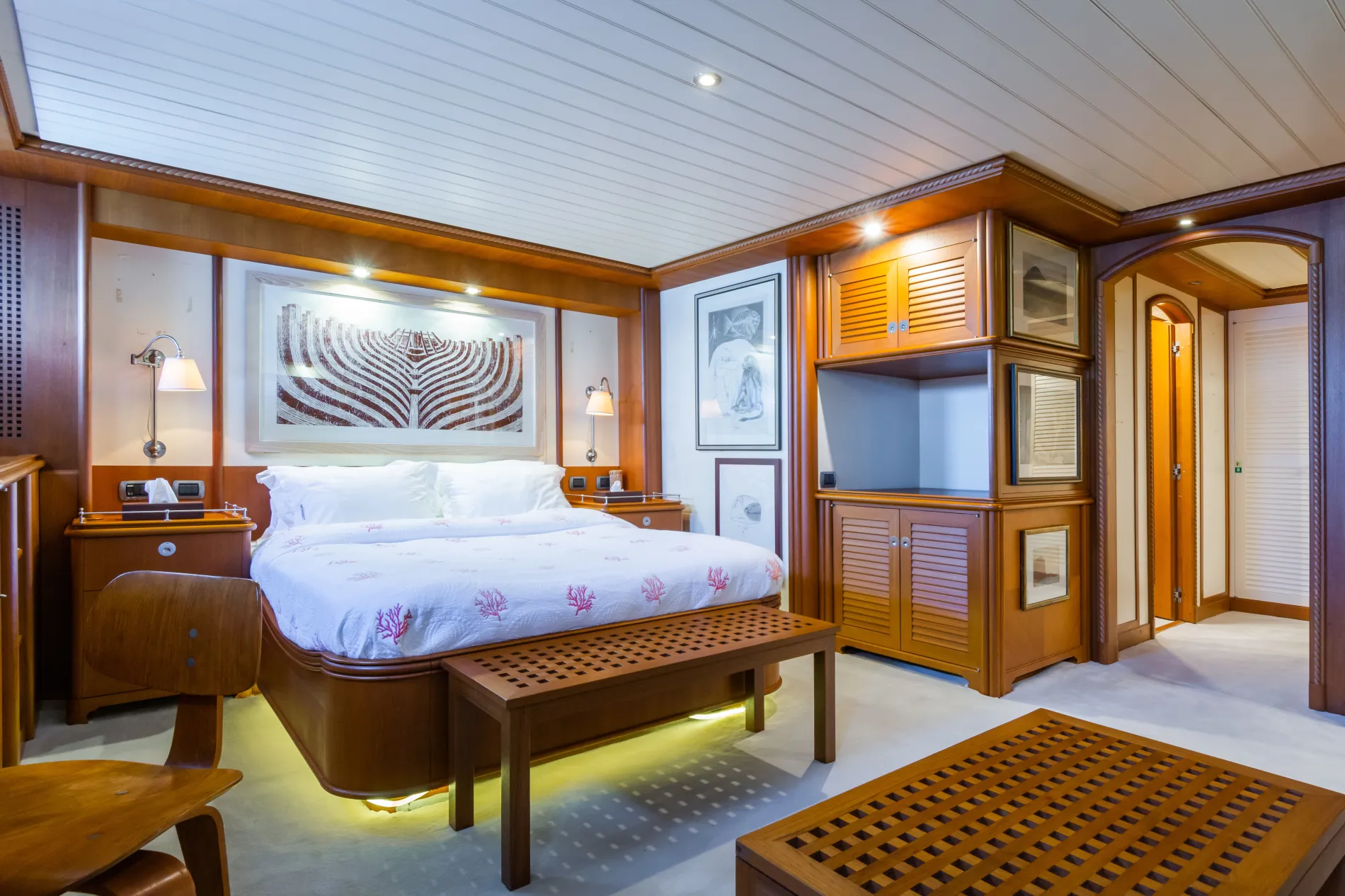 A light-filled VIP cabin on the main deck, finished in warm woods with refined joinery details.
