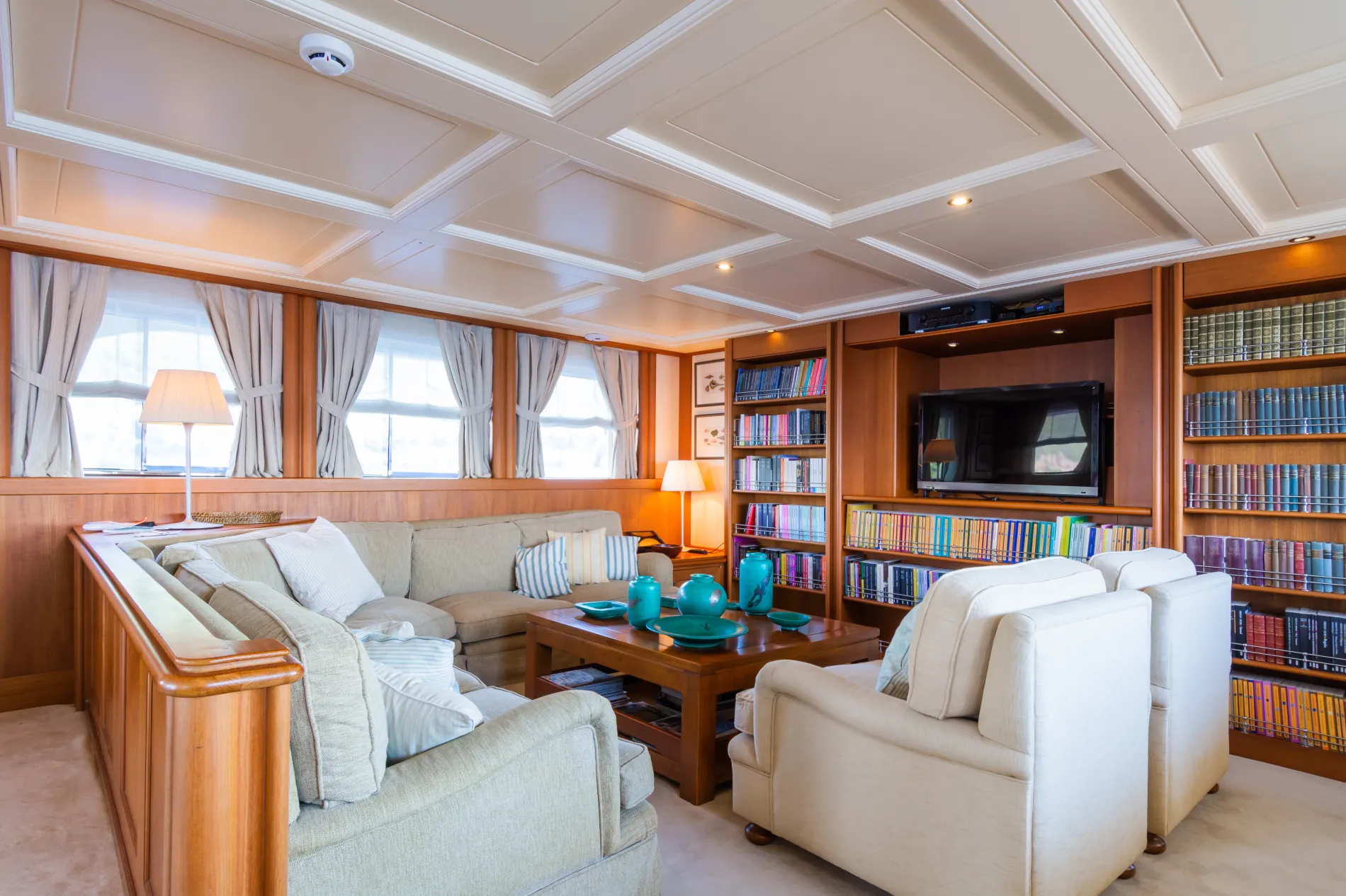 The main salon features picture windows, exquisite woodwork, comfortable sofas, and a recessed TV within a bookshelf.