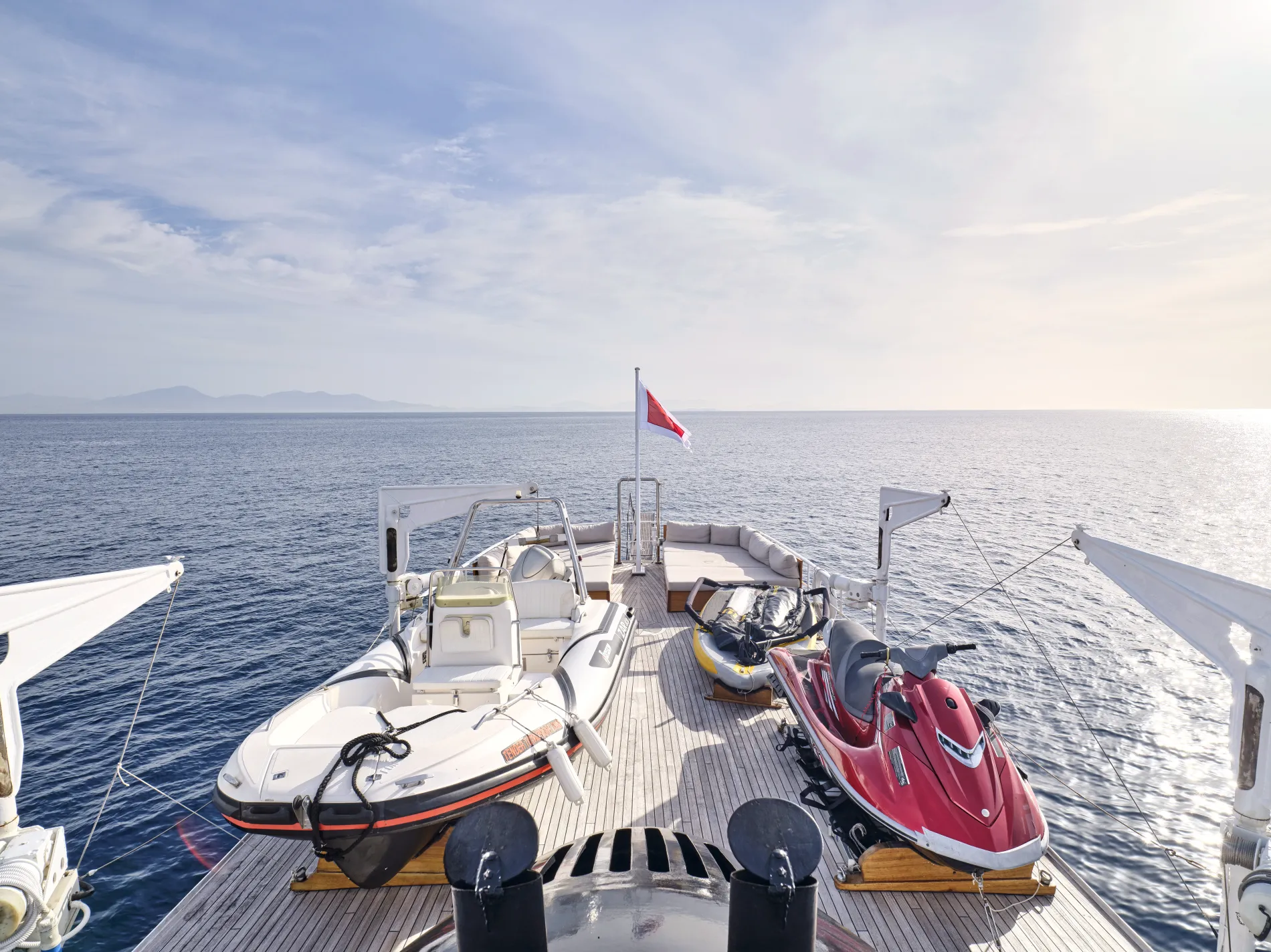A multi-purpose space, primarily used for tender and toy storage, with large sunpads aft.