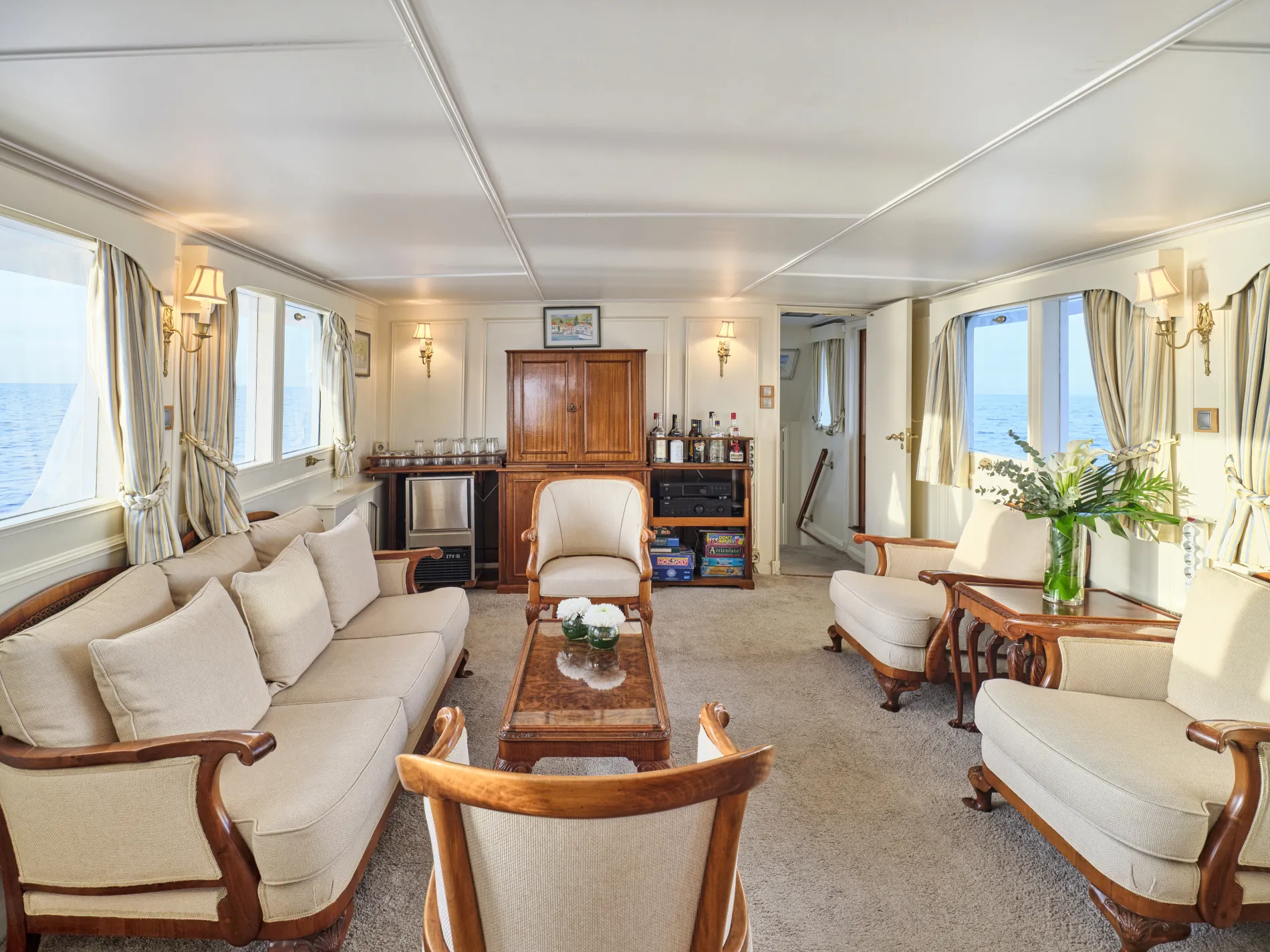 On the lower deck, accommodation is provided for six guests across four cabins, all featuring 1960s-inspired styling. The layout includes a full-beam suite with twin beds, a guest twin, and two single cabins. Above, a semi-sunken observation room has been converted into a a fifth cabin with direct access to the sun deck.