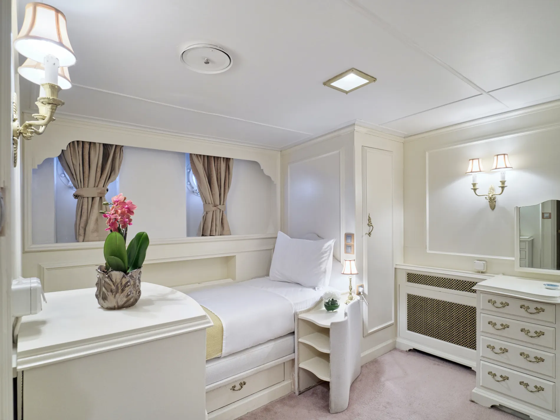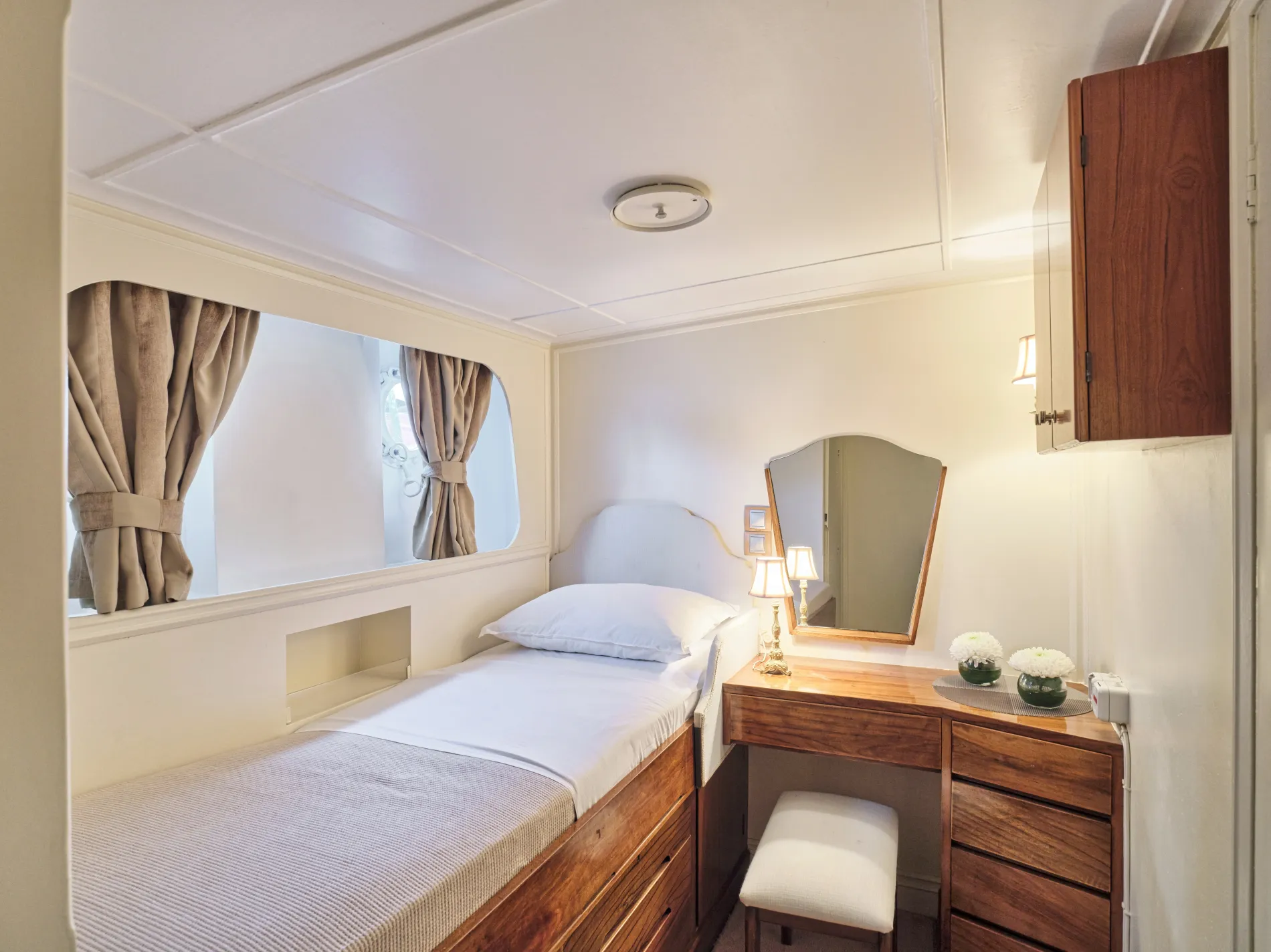 Two single cabins and one guest twin, each classically styled and comfortably appointed.