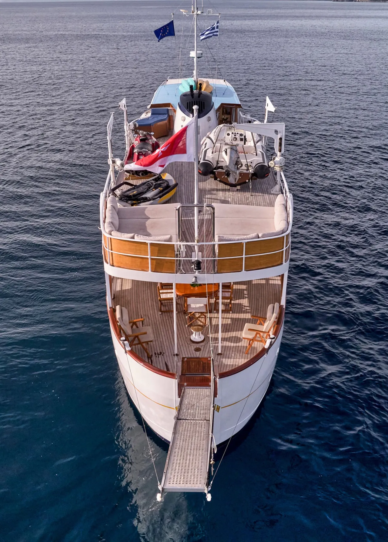Each deck of Midnight Sun invites a different mode of enjoyment—from sunbathing aft to morning coffee forward. Her curved canoe stern and classic lines are a testament to enduring naval design.