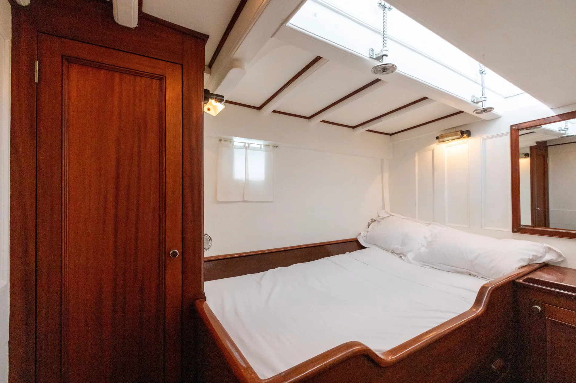 Traditional and warm, Milena’s interior blends mahogany carpentry with painted ceilings, evoking timeless yachting style. Spaces are arranged for comfort while preserving her authentic character.