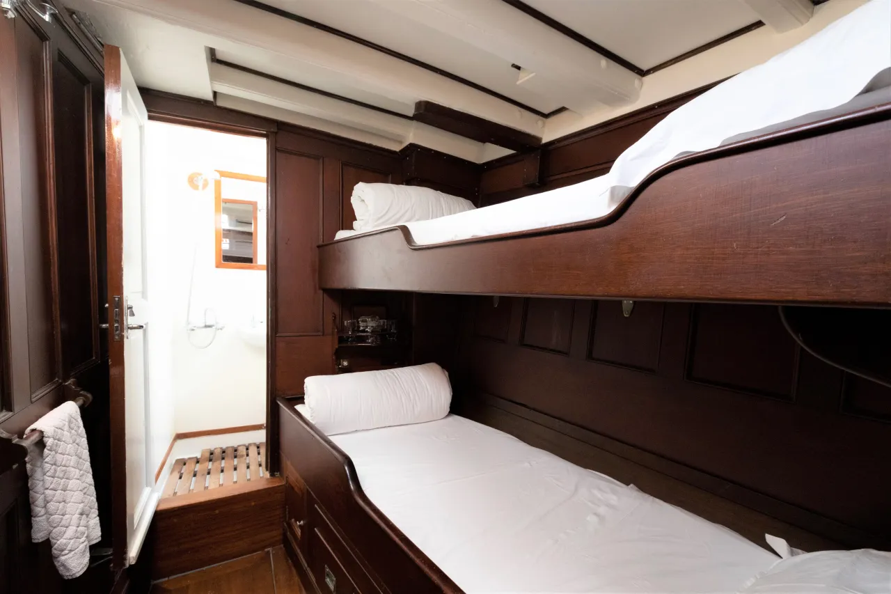 Forward of the saloon, the twin cabin has upper and lower berths with its own en suite shower.