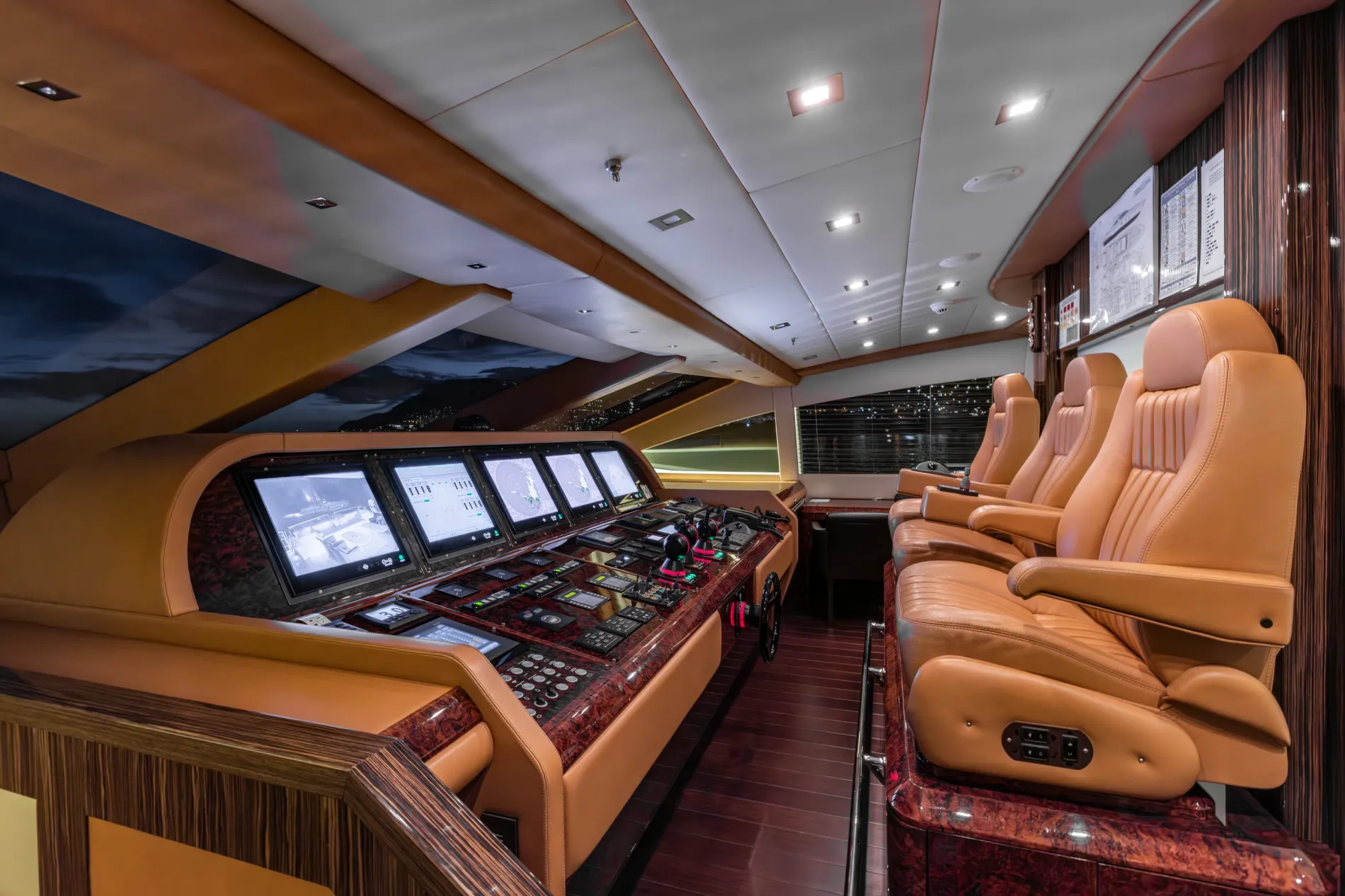 The wheelhouse is separated from the salon by a glass partition with an opaque switch.