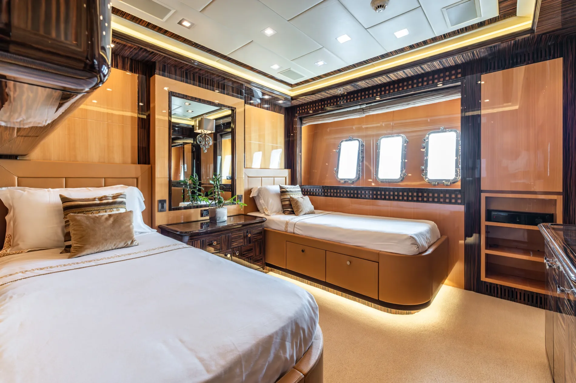 Midship full-beam suite featuring a king-size bed, walk-in wardrobes, and dual en suites—one with a hammam/steam shower, the other with a bathtub.