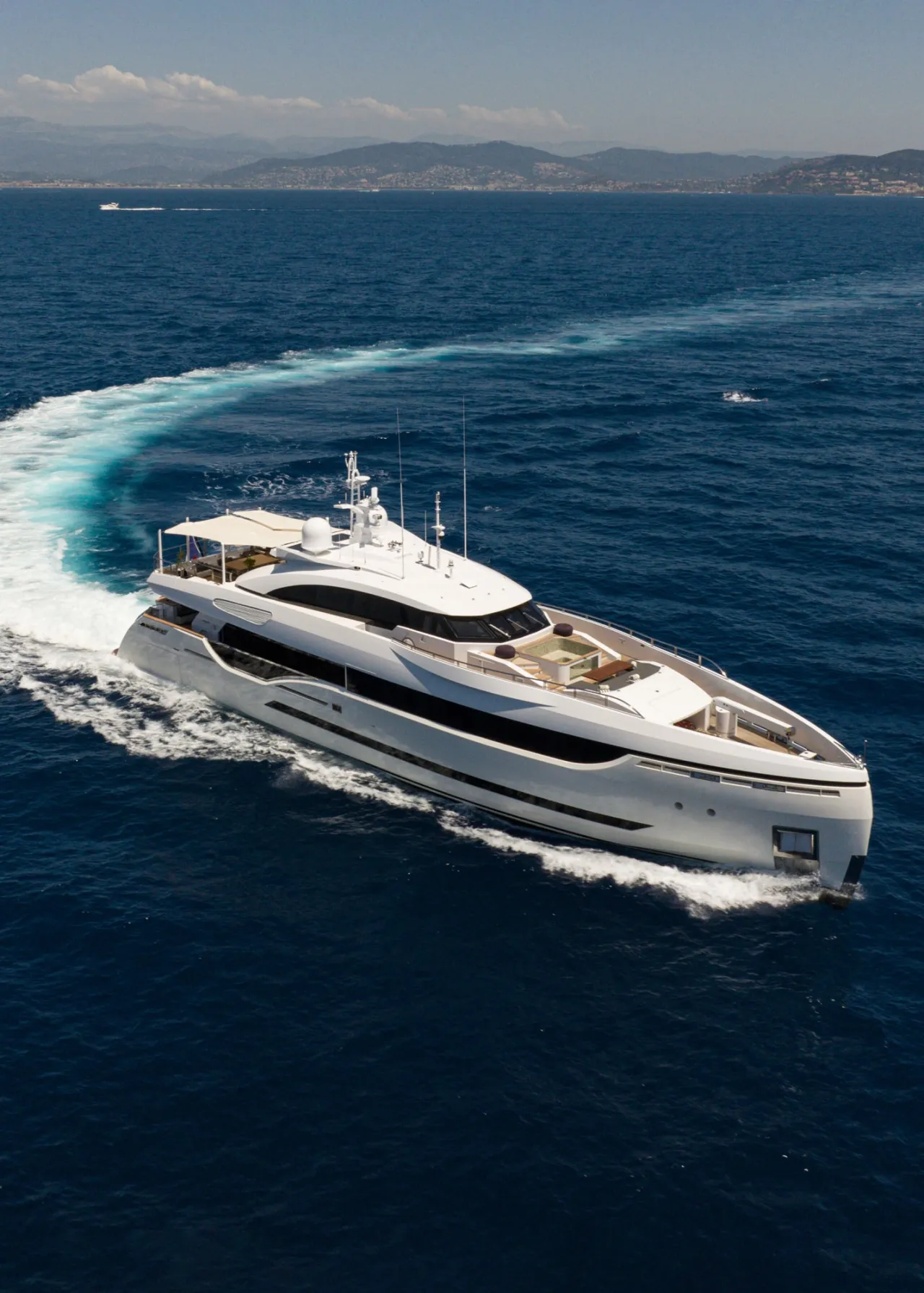 At the stern, the fold-down transom creates a beach club with a bar, shower, and built-in steps that lead directly into the sea. A side-launching tender garage provides discreet storage for tenders and toys.