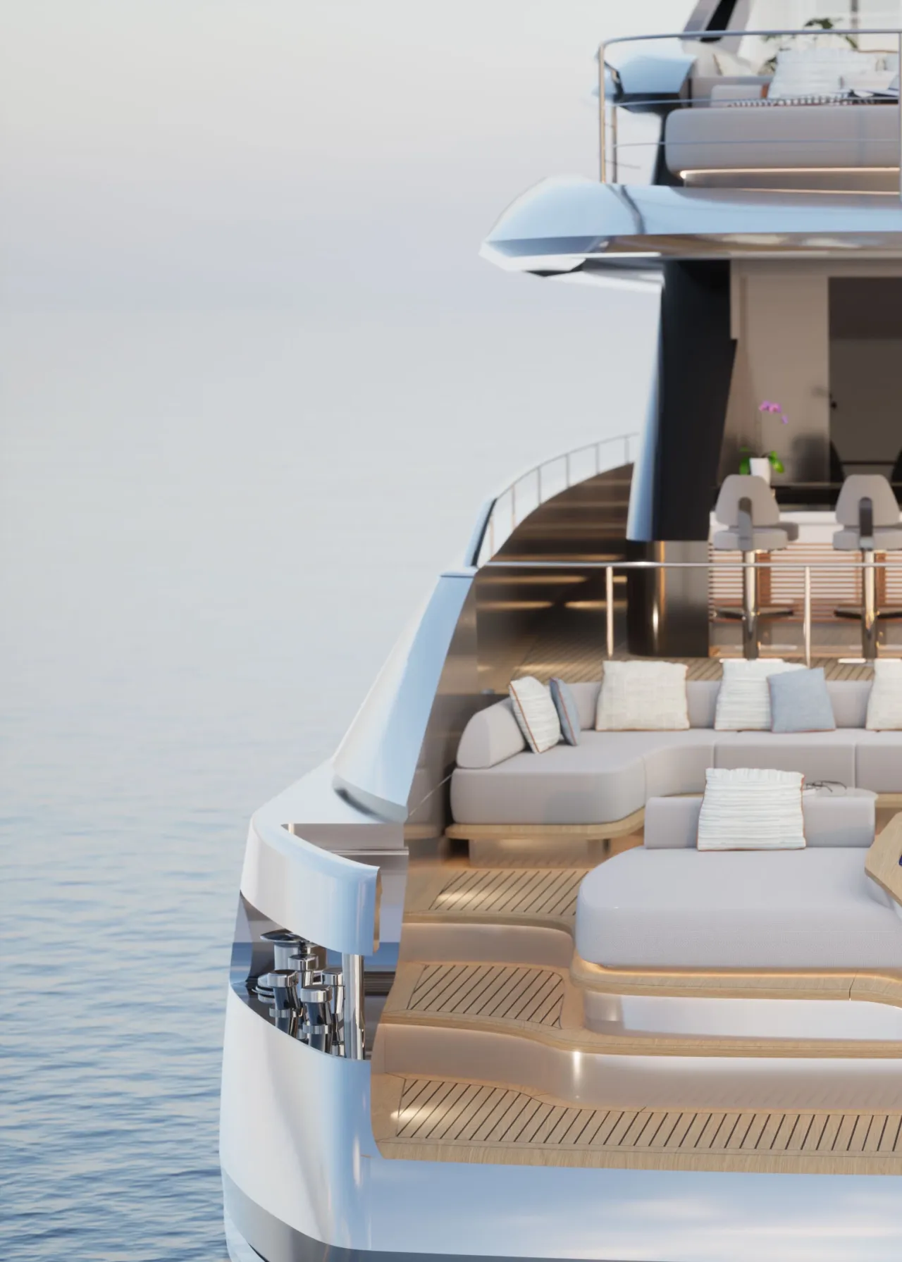 An open aft deck shapes the stern across three distinct levels: a swim platform, a pool and lounge just above, and a bar set on the main deck.