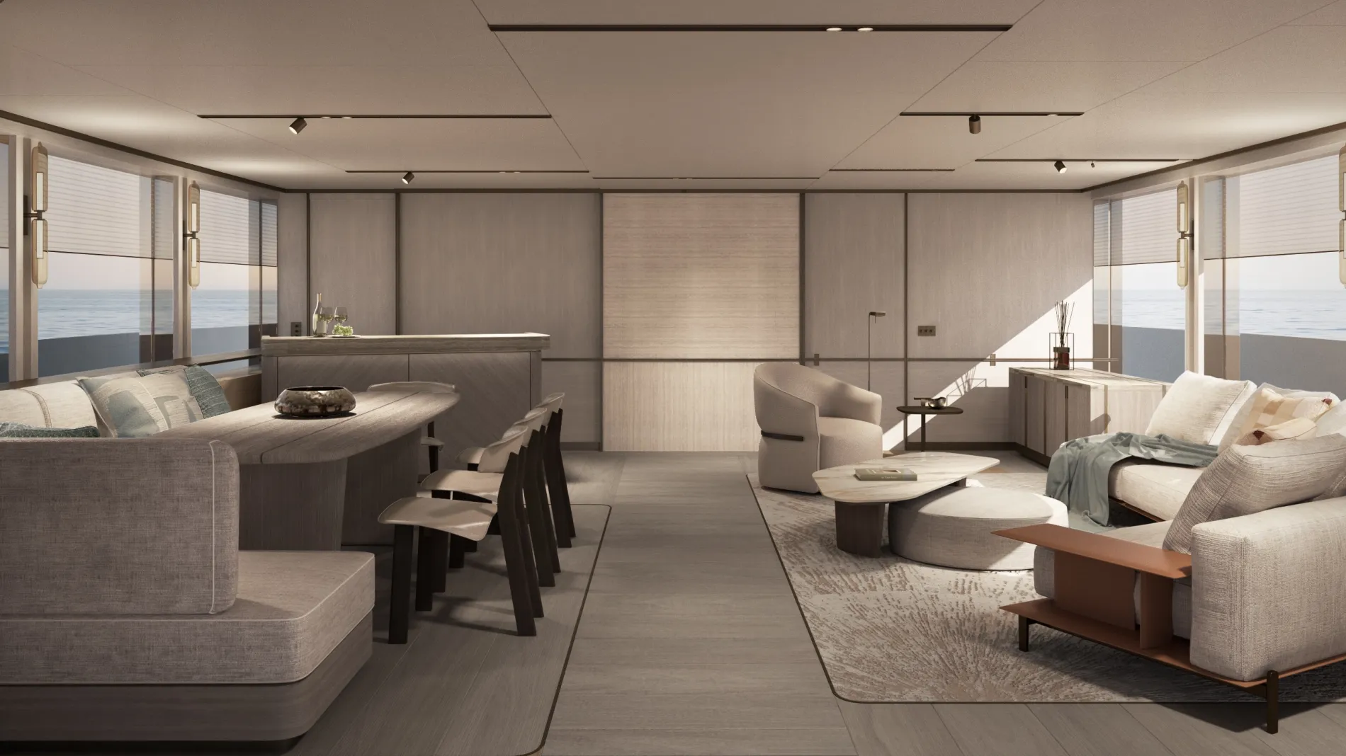 The main salon combines lounge seating and dining within a single open space, framed by expansive glazing that maintains a constant visual connection to the sea.
