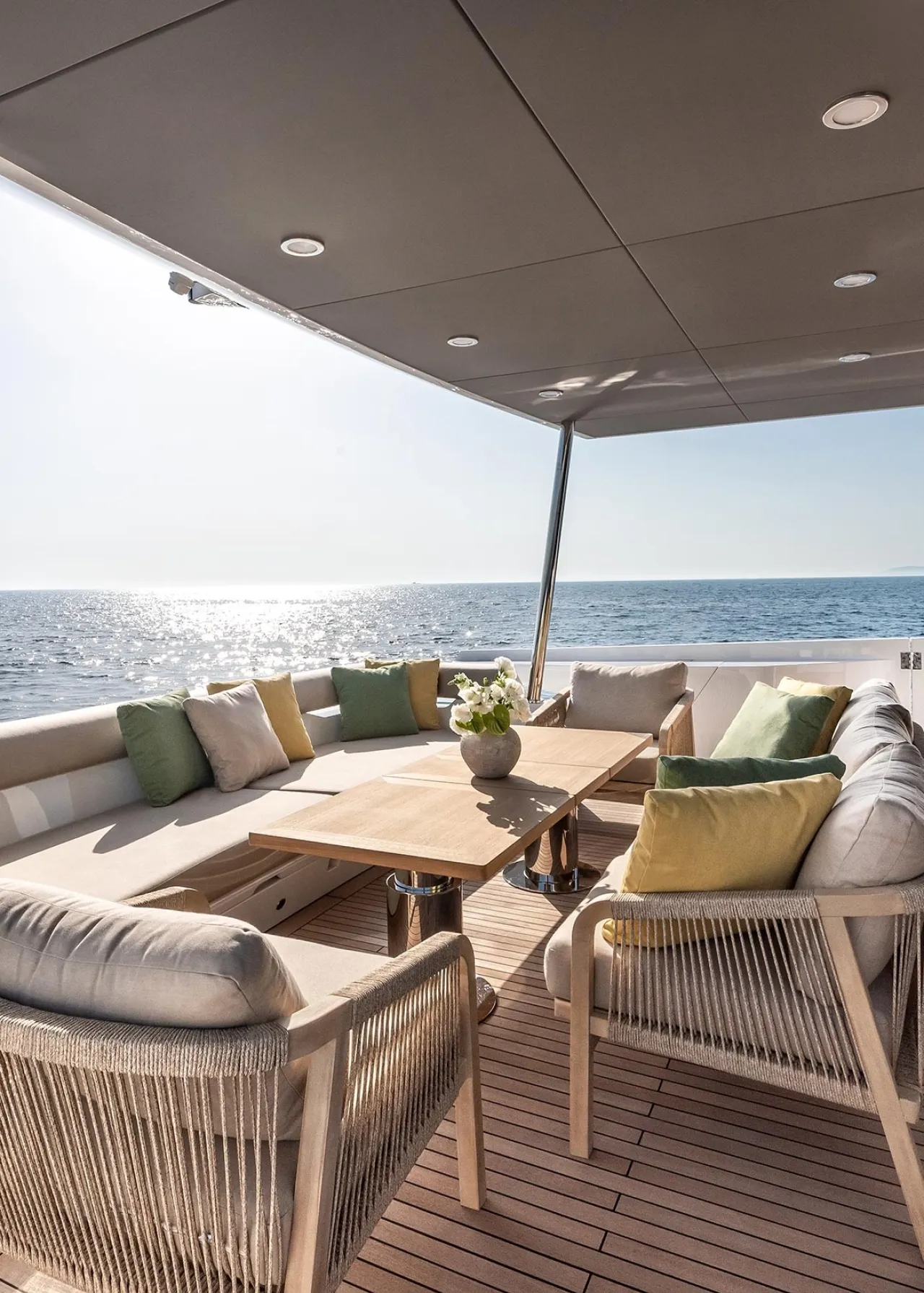 The cockpit serves as a shaded lounge with freestanding furniture and an extendable table, creating a flexible setting for dining at anchor.