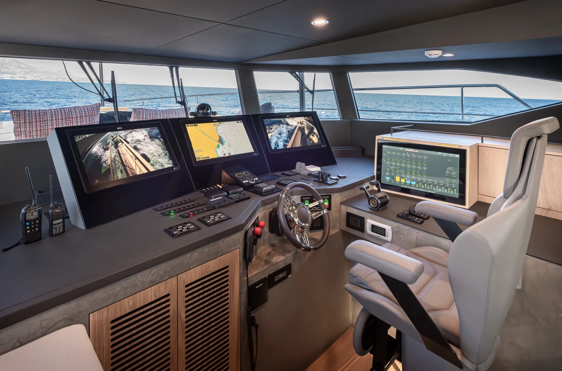 A vast, semi-shaded flybridge with adaptable layouts, offers space for lounging and al fresco dining.