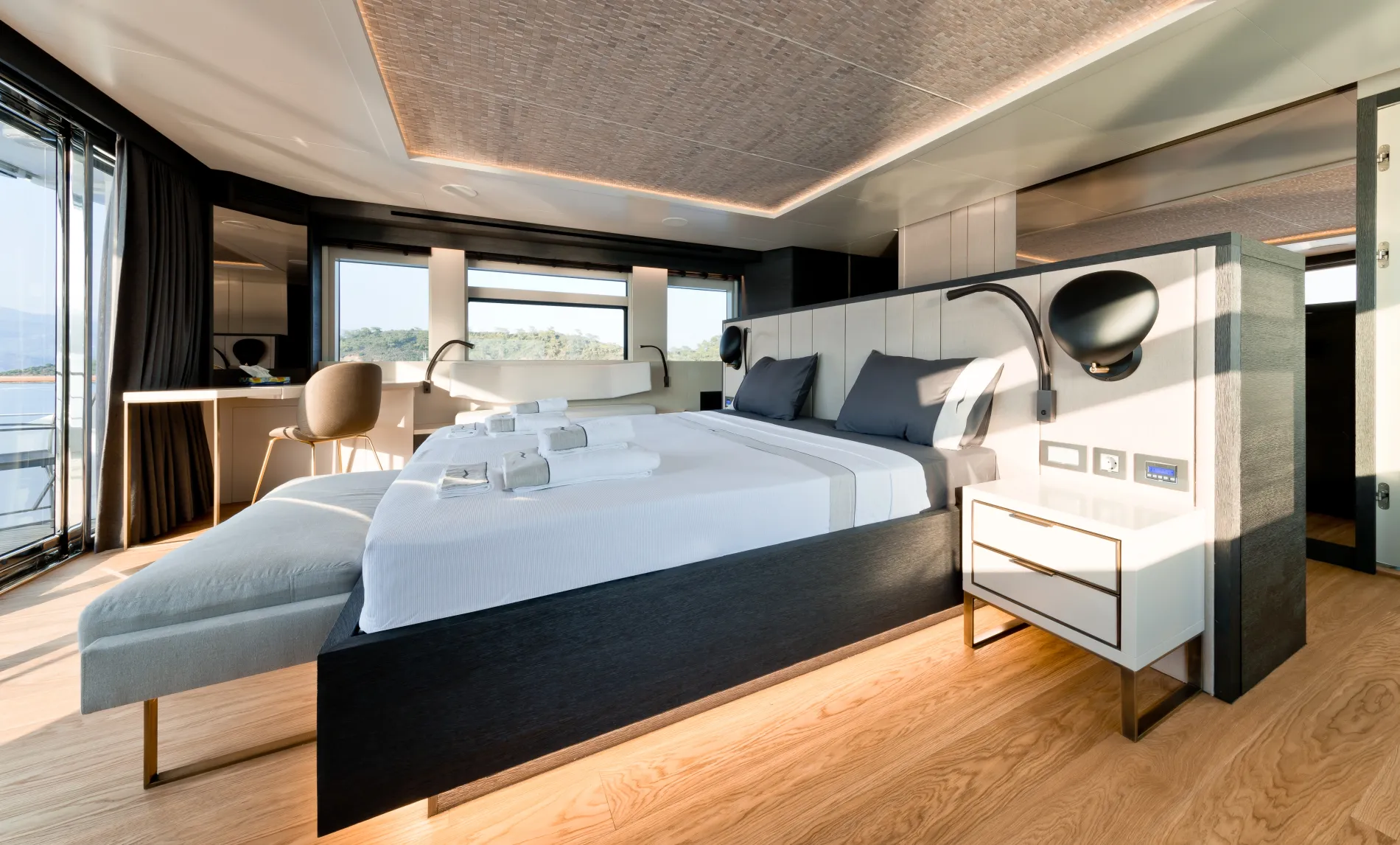 The 32XP series offers a standard six-cabin arrangement with a main-deck master suite, an upper-deck VIP and four guest cabins on the lower deck, but the layout can be configured to suit individual preferences.