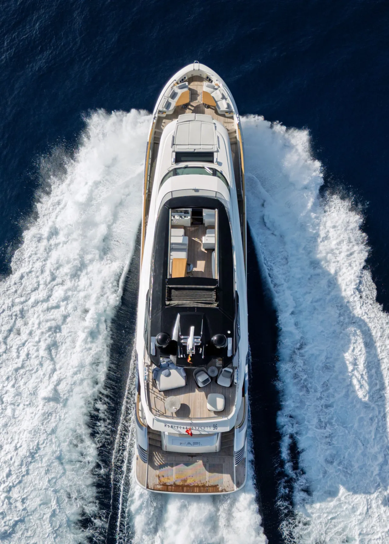 One of the largest in class, with a fully retractable carbon-fibre hardtop, BBQ station, dining table, and versatile lounging areas.