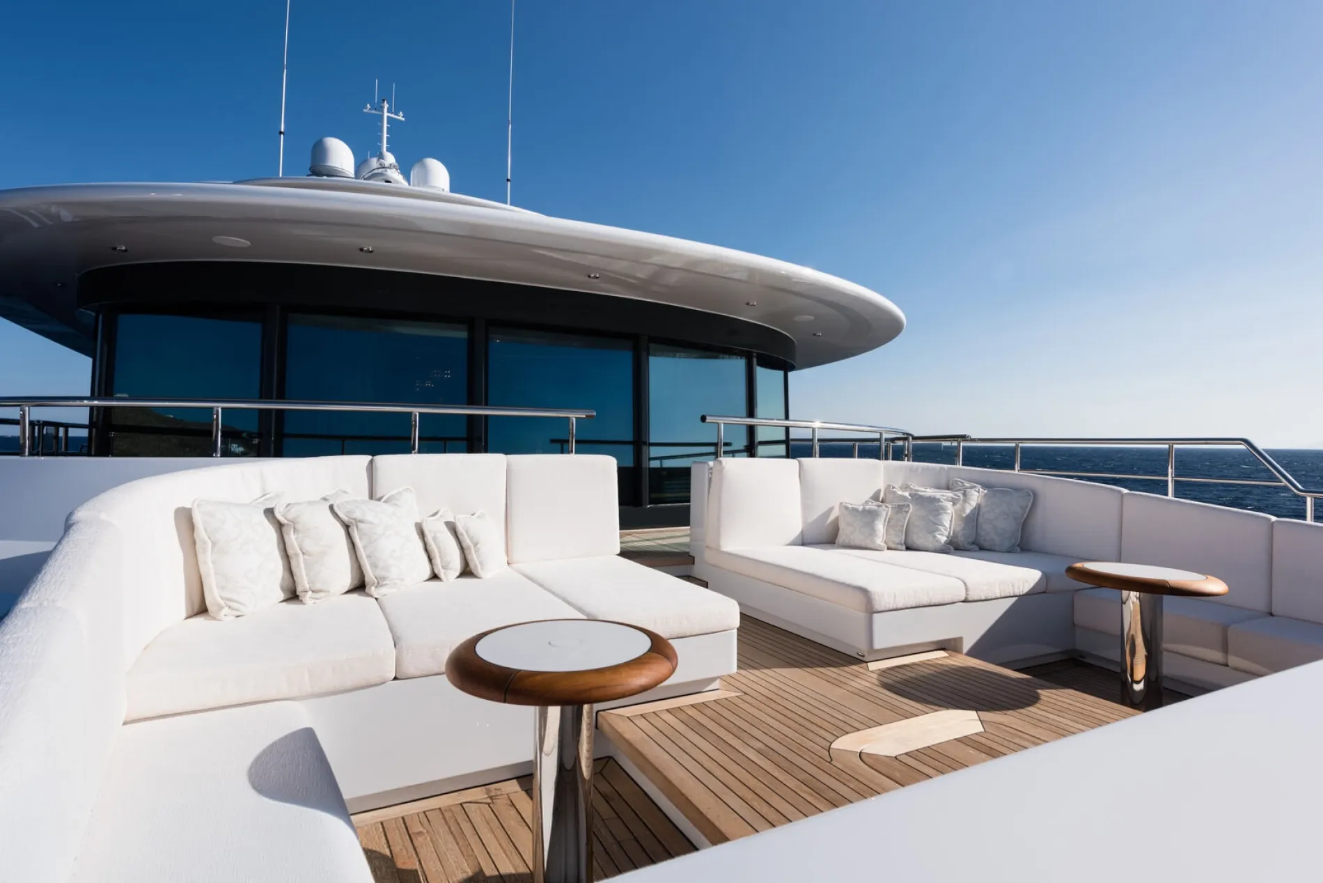 High above the water, the sundeck provides a Jacuzzi and seating areas to enjoy the uninterrupted panoramic views, making it ideal for sunbathing, socialising, or quiet moments at sea.