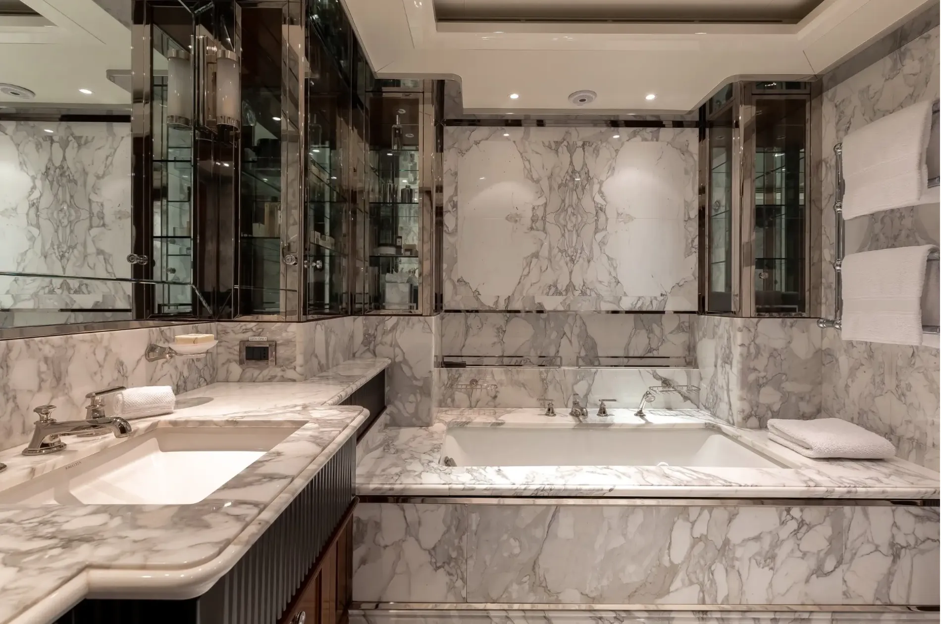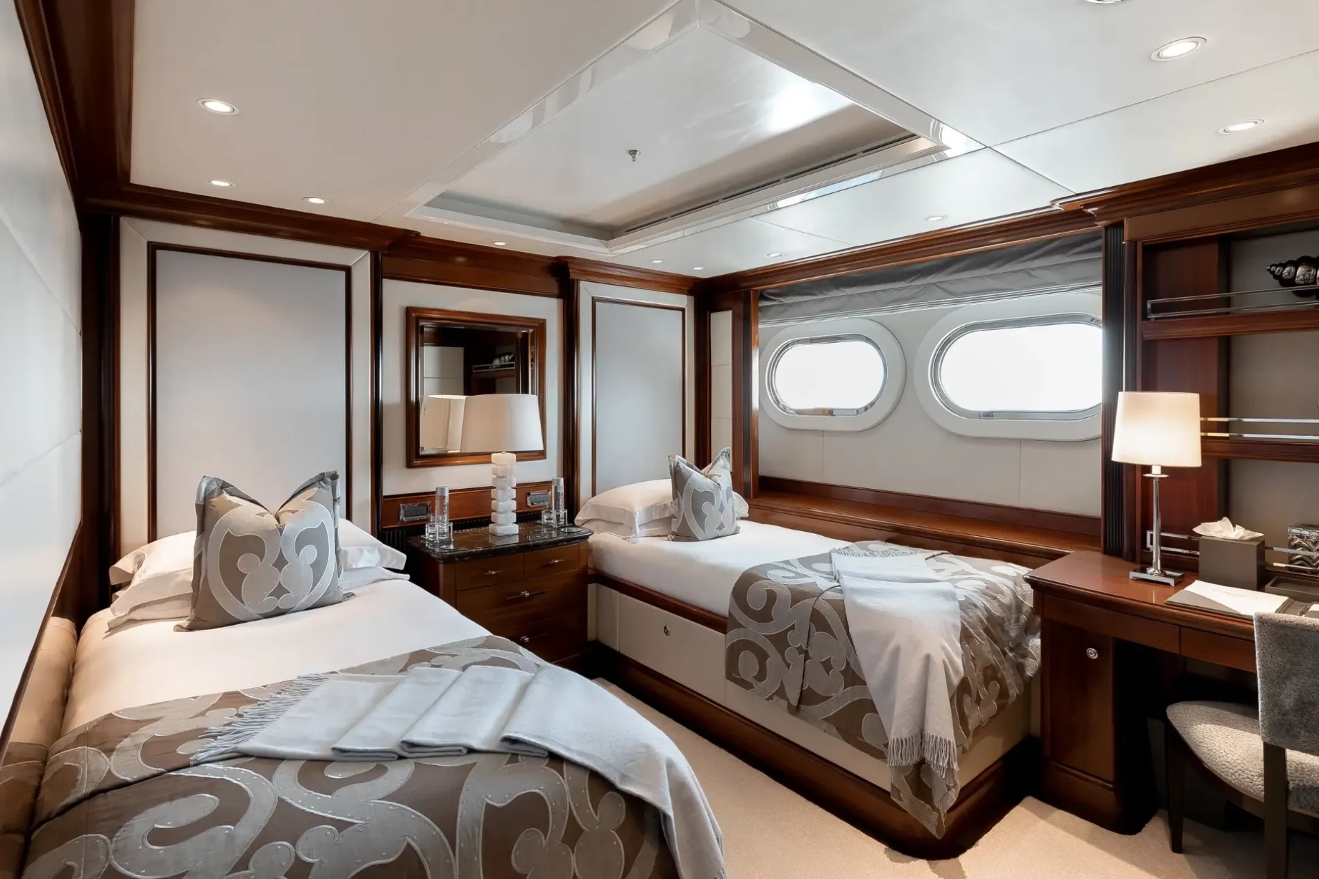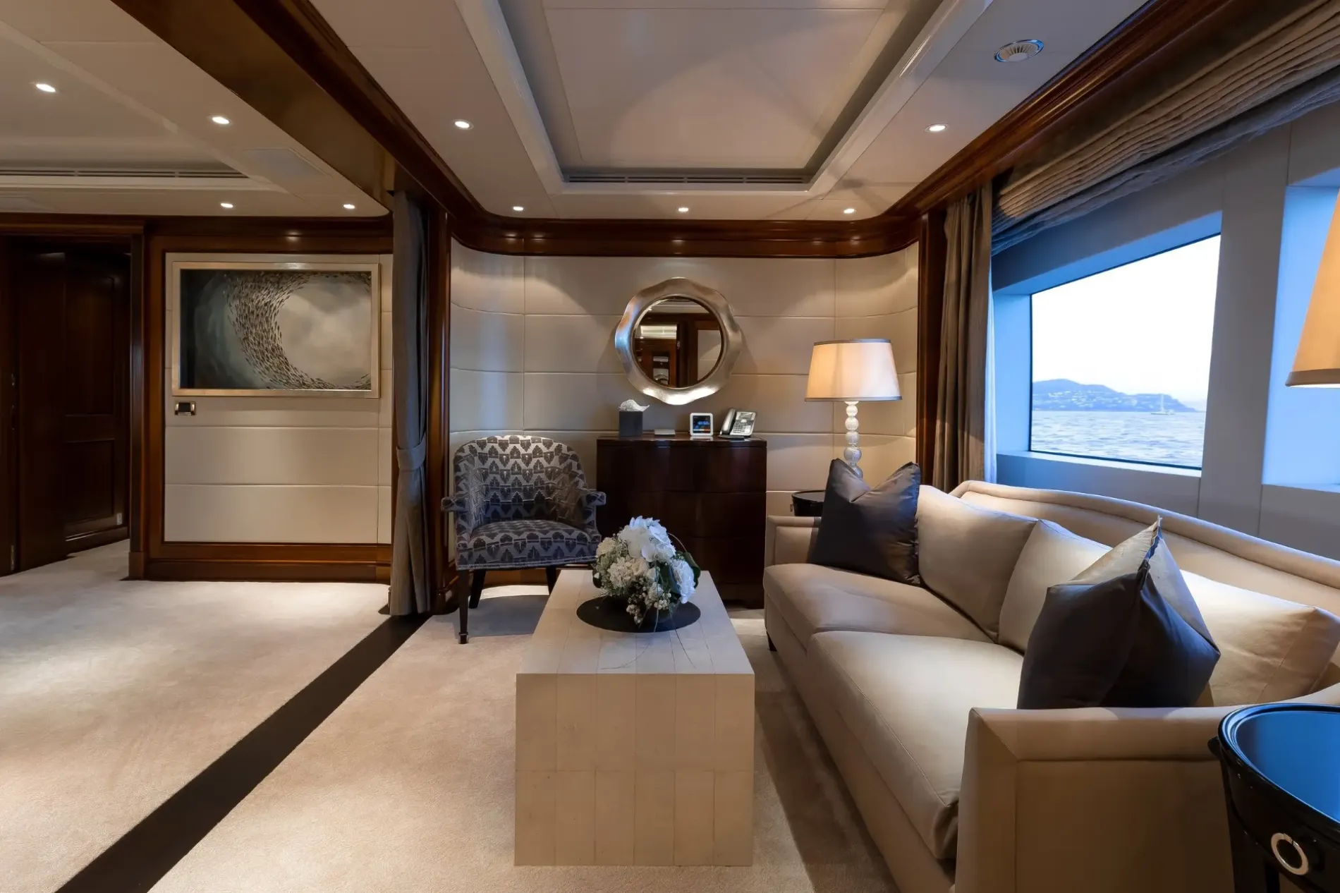 Positioned forward on the main deck and arranged as a private apartment, with a lounge, study, his-and-hers bathrooms with steam room and Jacuzzi bath, and separate walk-in wardrobes.