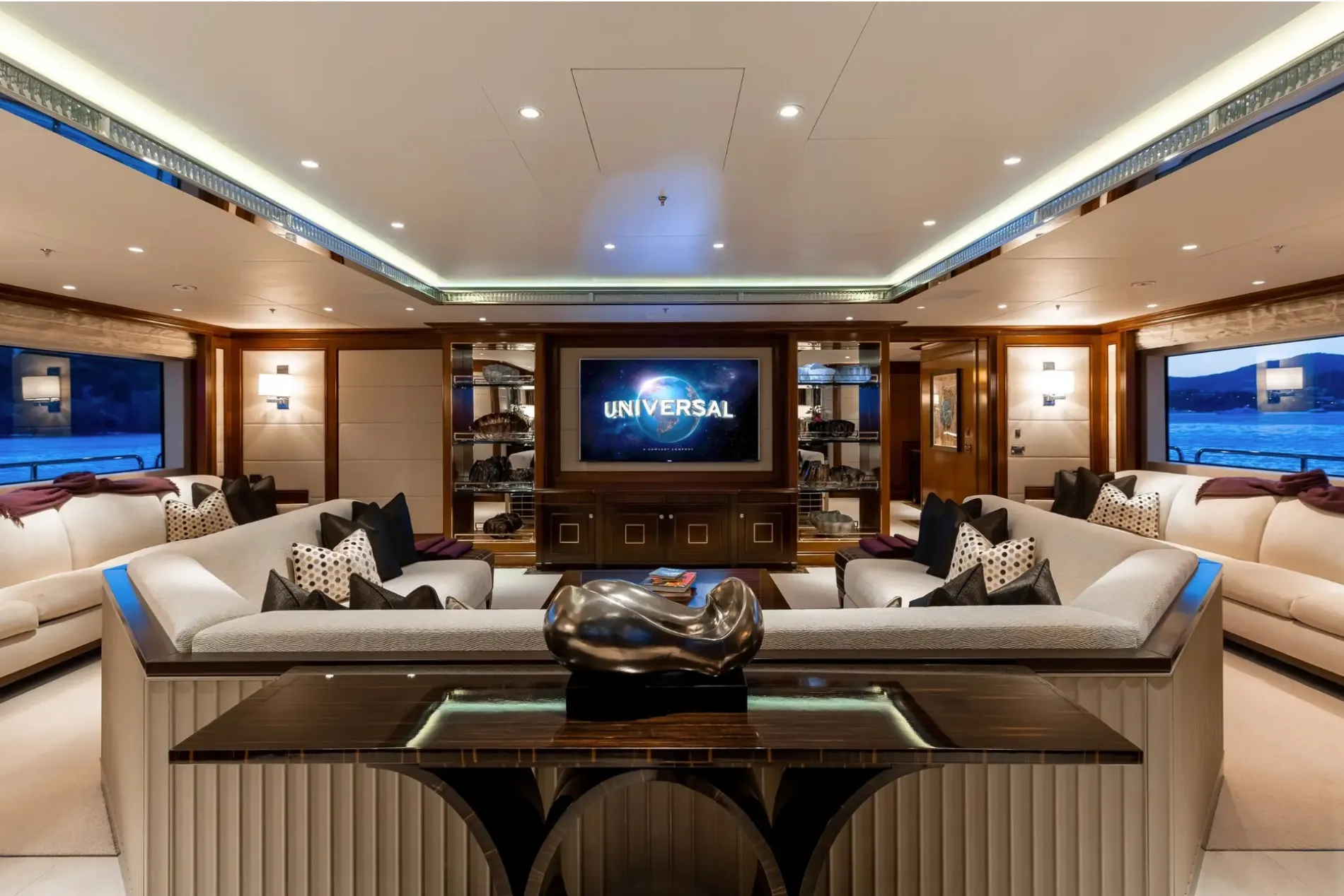 Instead of a conventional lounge, the main salon is configured as a cinema with a large television screen and custom sofa. Lighting, curtains and audio are all controlled via onboard tablets.